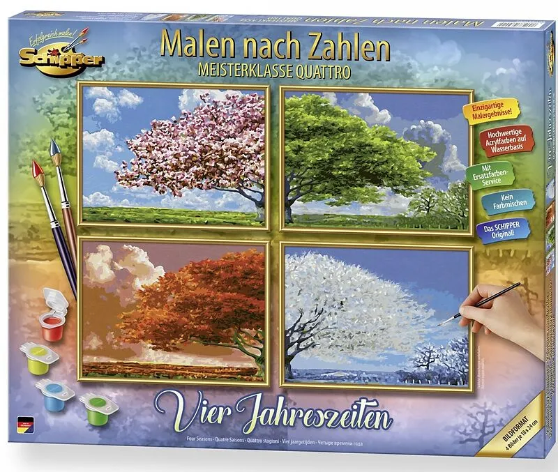 Größe: Jede der vier Maltafeln misst 18 x 24 cm Altersempfehlung: ab 14 Jahren Mit dem Meisterklasse Quattro Vier Jahreszeiten" von Schipper erhältst du die Möglichkeit, die einzigartige Schönheit der Jahreszeiten in einem vierfachen Kunstwerk zu verewigen. Di...