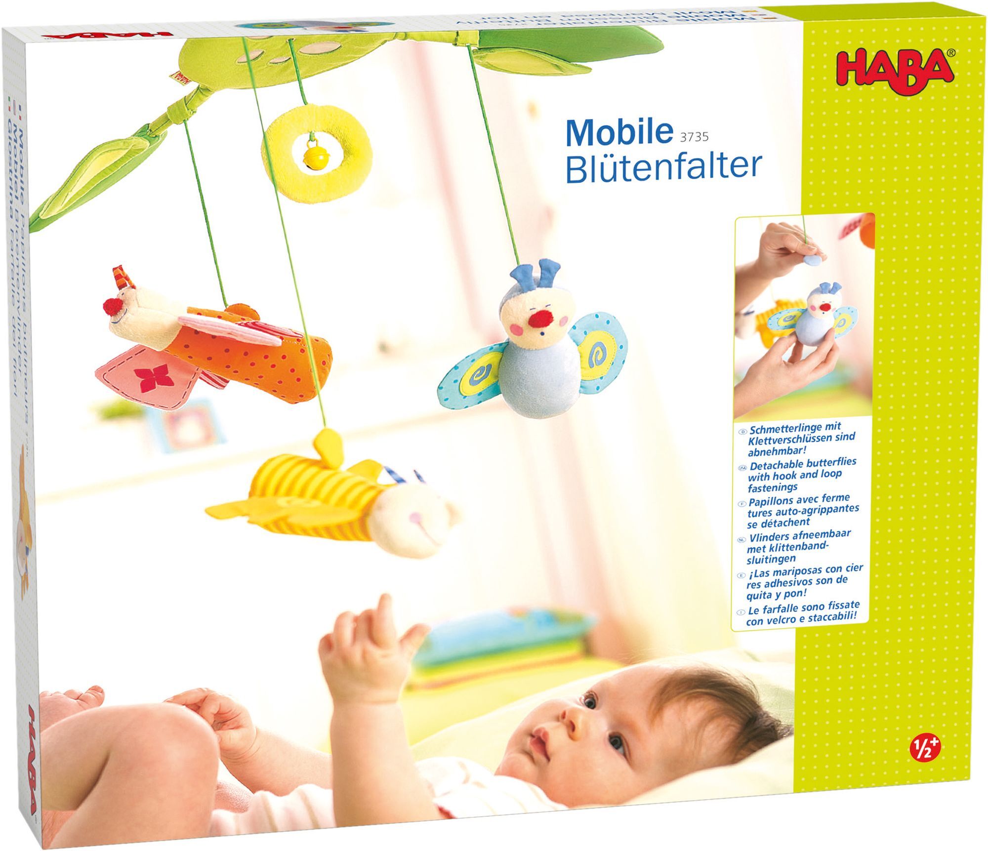 Huch, was flattert denn da so fröhlich durchs Kinderzimmer? Gleich drei muntere Schmetterlinge ziehen beim HABA-Mobile Blütenfalter ihre Kreise über Babys Bettchen oder Wickeltisch. Ein Glöckchen sowie Spiegelfolie am Blätterdach geben weitere optische und aku...