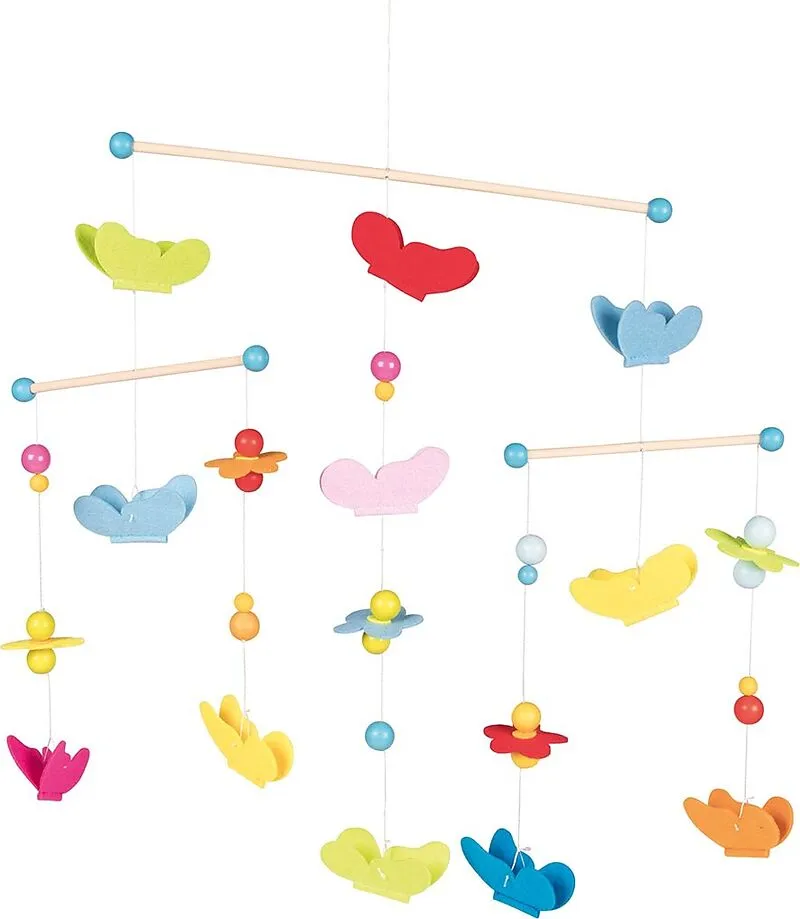 Welches Tier schwebt schon leichter und anmutiger über die sommerlichen Blumenwiesen als ein Schmetterling? Das Ganzjahres-Mobile mit seinen farbenfrohen Schmetterlingen aus Filz bringt diese Leichtigkeit in jedes Kinderzimmer.