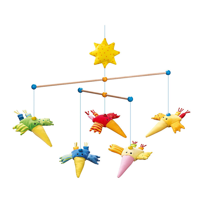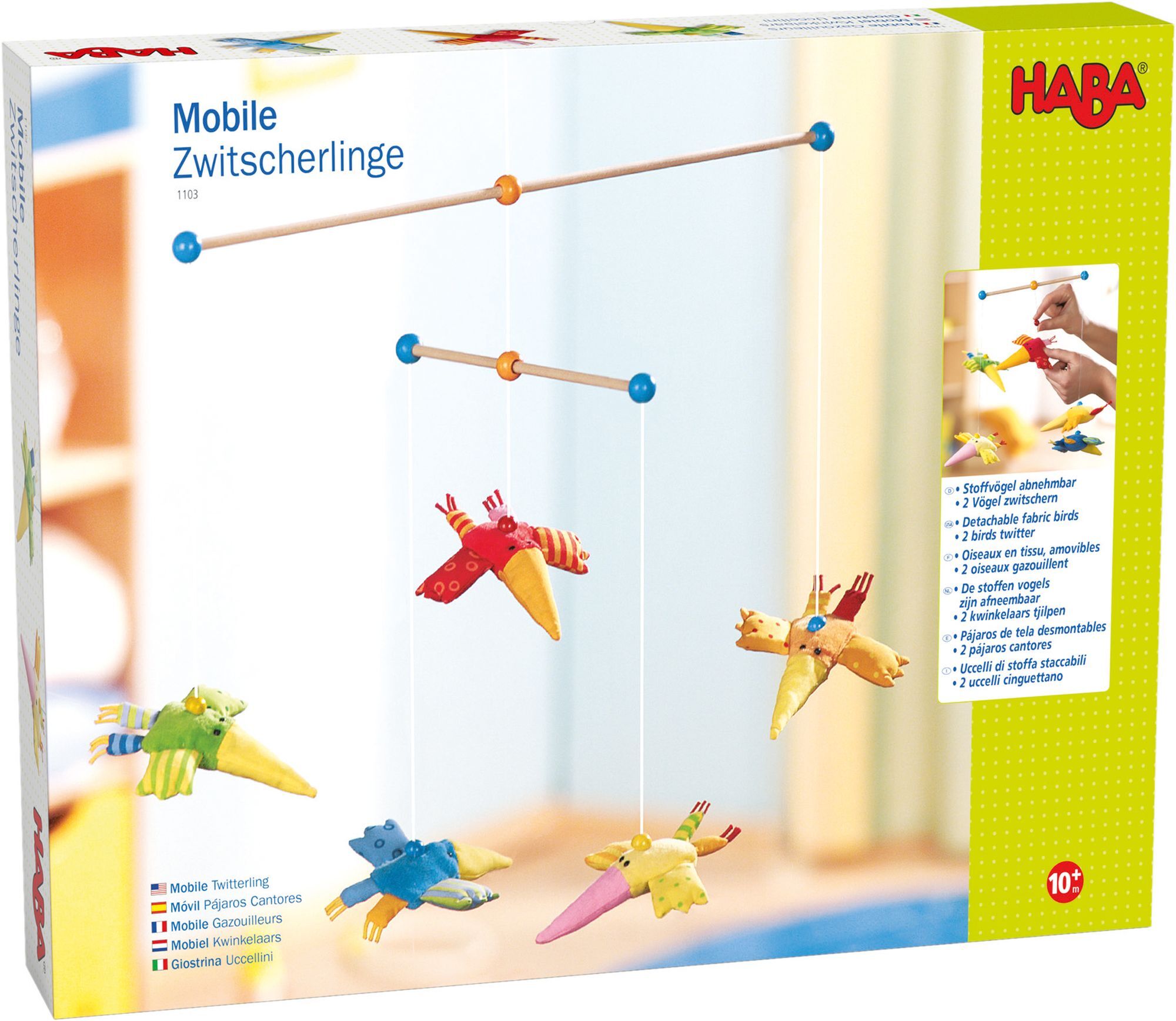 Zwitscherlinge. Von der Zimmerdecke fliegen die Paradiesvögel bis in Babys Hand: Die Anhänger aus weichem Stoff sind mit Magneten befestigt und abnehmbar. Mit 2 Quietschen. Maße: Vögel 13 cm groß, handwaschbar.