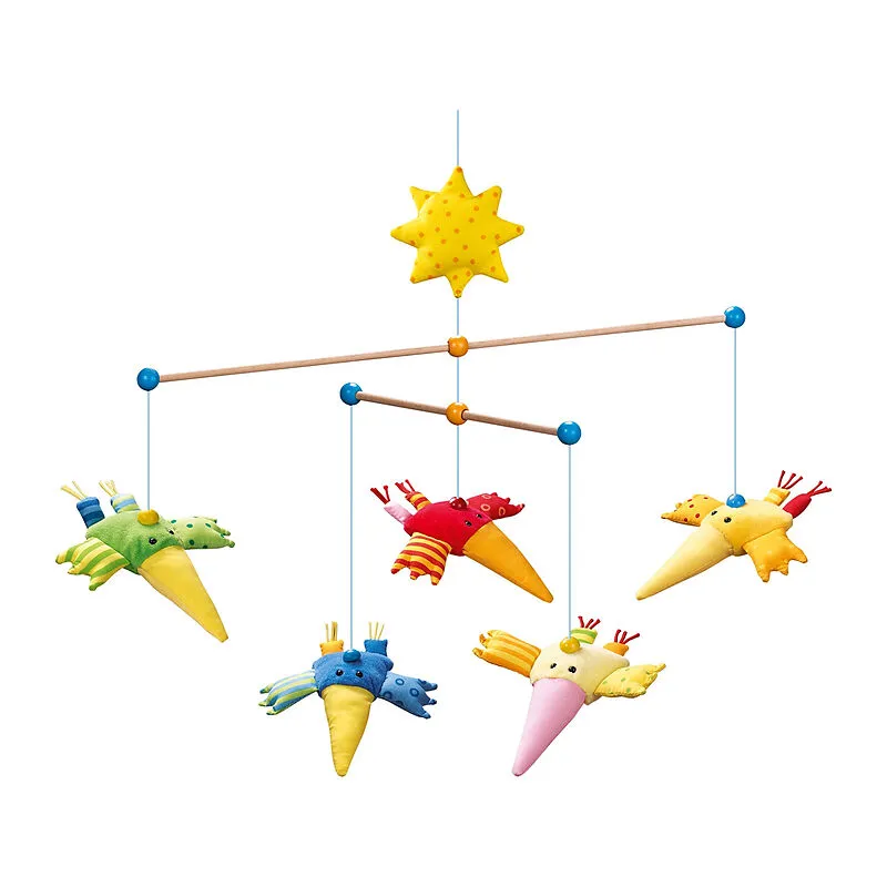 Zwitscherlinge. Von der Zimmerdecke fliegen die Paradiesvögel bis in Babys Hand: Die Anhänger aus weichem Stoff sind mit Magneten befestigt und abnehmbar. Mit 2 Quietschen. Maße: Vögel 13 cm groß, handwaschbar.
