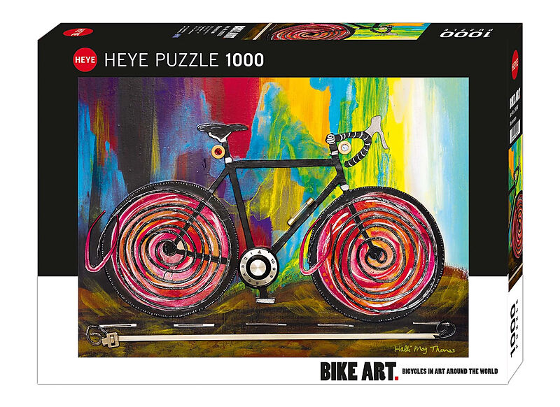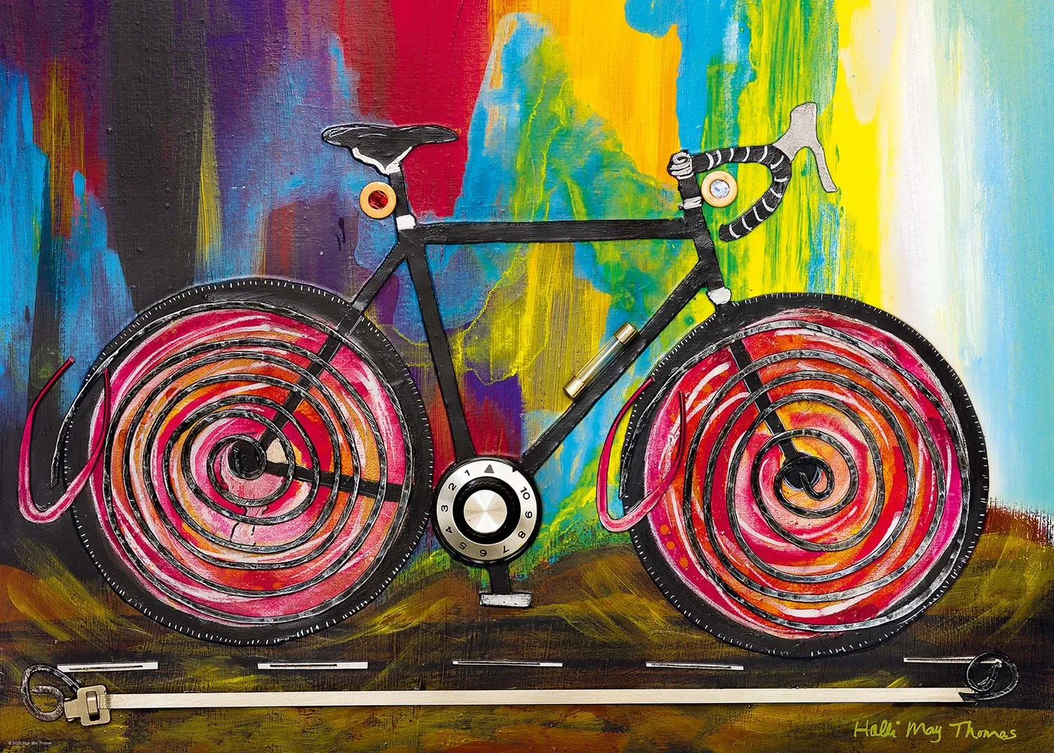 Holli May Thomas verwendet upgecycelte Materialien, Fundstücke, Papier und viel Farbe in ihren energiegeladenen Mixed-Media-Collagen. Lieblingsmotiv: Das Fahrrad! Gelegte Größe: 70x50 cm.