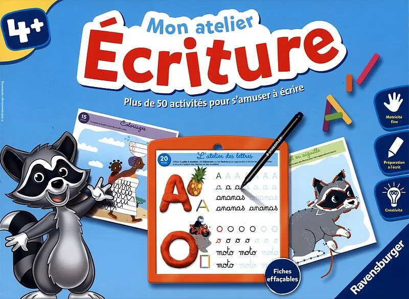 My Writing Workshop vereint mehr als 50 lustige, originelle und kreative Aktivitäten in einer einzigartigen Schachtel, um Kindern die Grundlagen des Schreibens näherzubringen: Schnürsenkel zum Einfädeln durch Bretter mit Löchern zur Entwicklung der Feinmotorik...