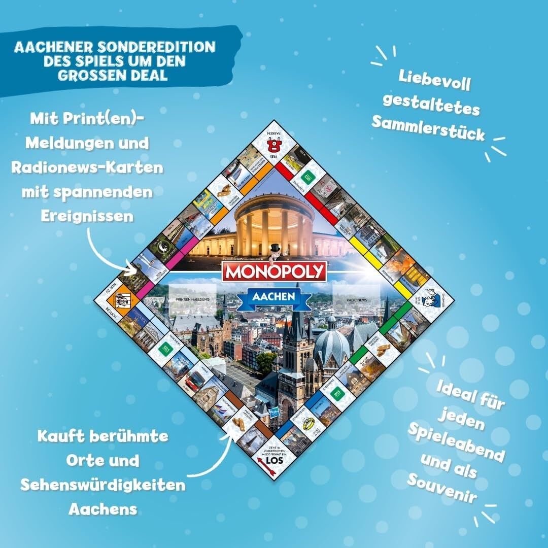 Das berühmte Brettspiel gibt es jetzt auch für die Stadt Aachen. Spiele mit der ganzen Familie und entdecke Aachens Sehenswürdigkeiten sowie spannende Aufgaben in den auf Aachen zugeschnittenen Ereignis- und Gemeinschaftskarten. Schnappe dir deine Familie und ...