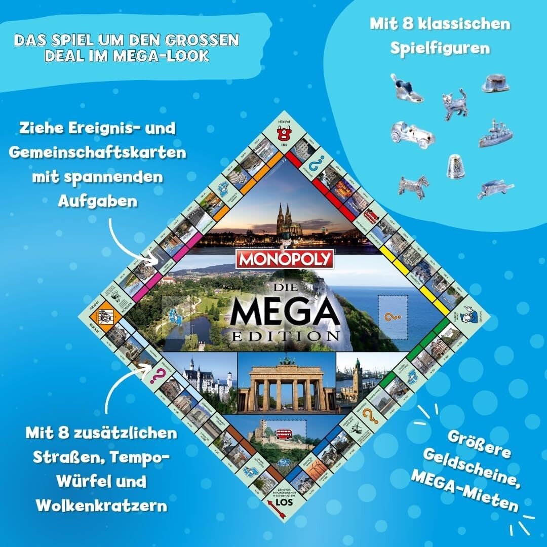 Das brandneue Mega Monopoly mit tollen Bildern und großen Geldbeträgen im Grossformat. Spielmaterial: 1 Spielplan, 8 Spielfiguren, 28 Besitzrechtkarten, 16 Ereigniskarten, 16 Gemeinschaftskarten, 16 Shuttle-Tickets, 1 Satz MONOPOLY Spielgeld, 32 Häuser, 12 Hot...