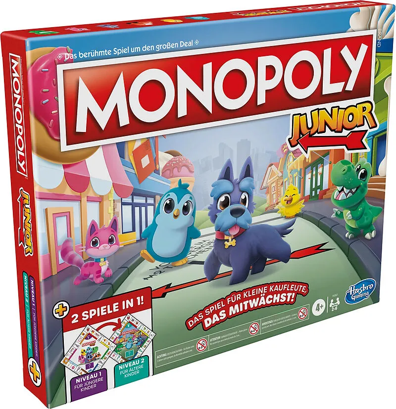 Monopoly Junior Monopoly Junior 2-in-1 ist ein Spiel für kleine Kaufleute, das mitwächst! Der doppelseitige Spielplan bietet 2 Spielniveaus, damit Familien genau das für sie passende Spiel auswählen können. Niveau 1 ist für Kinder von 4-5 Jahren geeignet und h...
