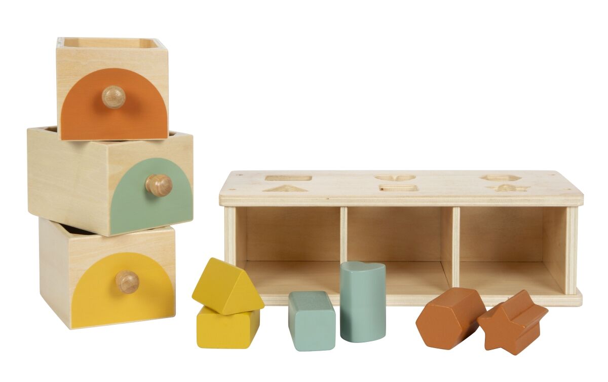 Sortieren, Stecken, Lernen diese Montessori Steck-Schubladenbox aus FSC 100%-zertifiziertem Holz mit sechs farbigen Stecksteinen und drei Schubladen lädt Kinder zum Spielen und Entdecken ein. Mit sanften Farben, glatten Kanten und einer klaren Struktur fördert...