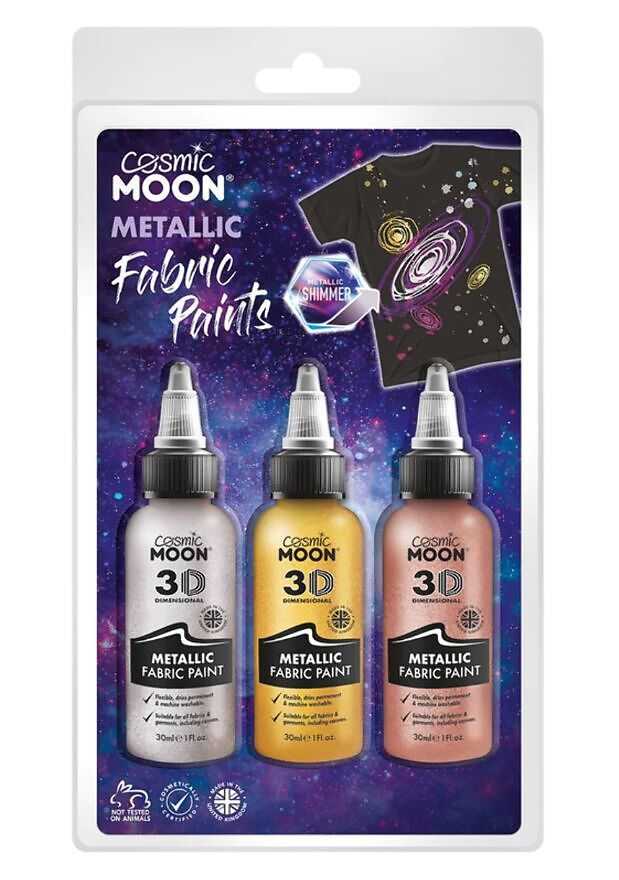 Inhalt: 3 x 30 ml Farbe: silber, gold, rose gold Hochwertige 3D-Stofffarbe für einen schimmernden Metallic-Look! Streichen Sie die Stoffmalfarbe einfach auf den Stoff Ihrer Wahl und lassen Sie sie 24 Stunden lang trocknen. Alternativ können Sie die Stoffmalfar...