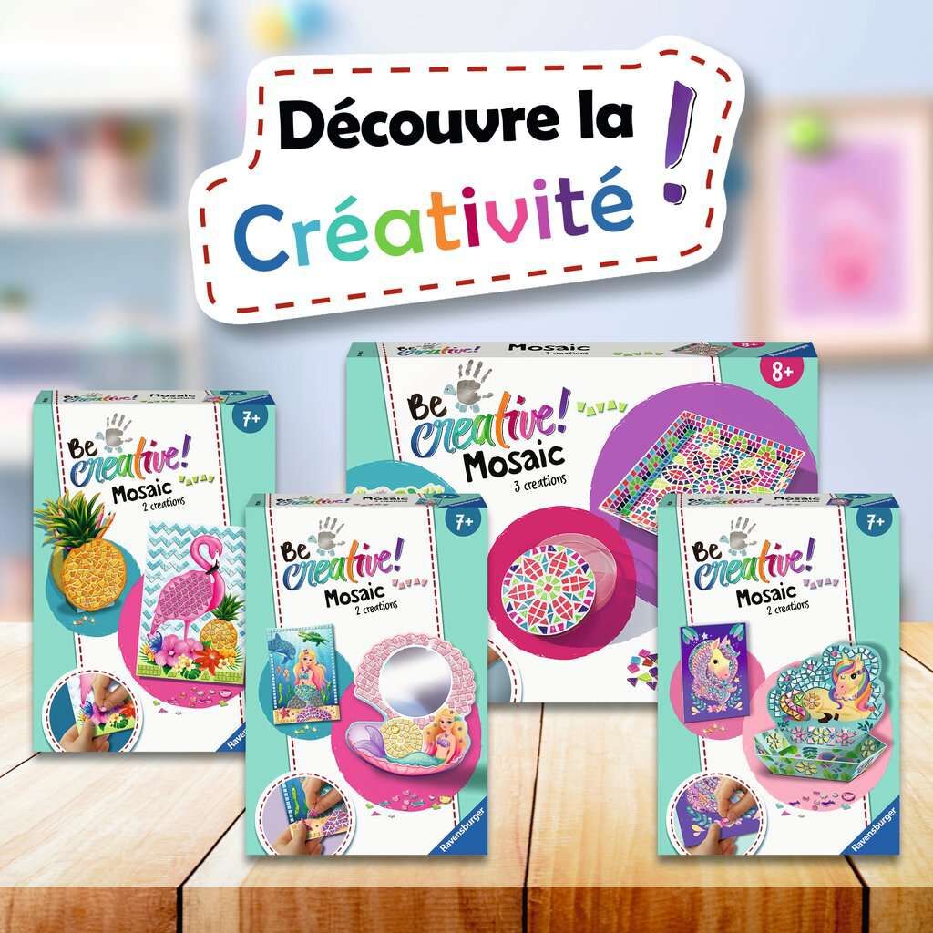 Mit dem Ravensburger BeCreative Set Mosaic Midi Tropical entstehen schöne Bilder und 3D-Objekte aus bunten Mosaikteilen. Zum Einstieg in die Mosaiktechnik dient eine illustrierte Bild-Tafel mit Flamingo und ein 3D-Deko-Objekt in Form einer Stiftebox. Erste kre...