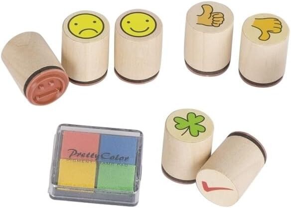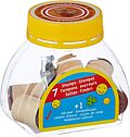 Inhalt: 7 Stempel a 2,5 x 2,2 cm in Dose. Material: Holz. Mit Stempelkissen.