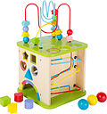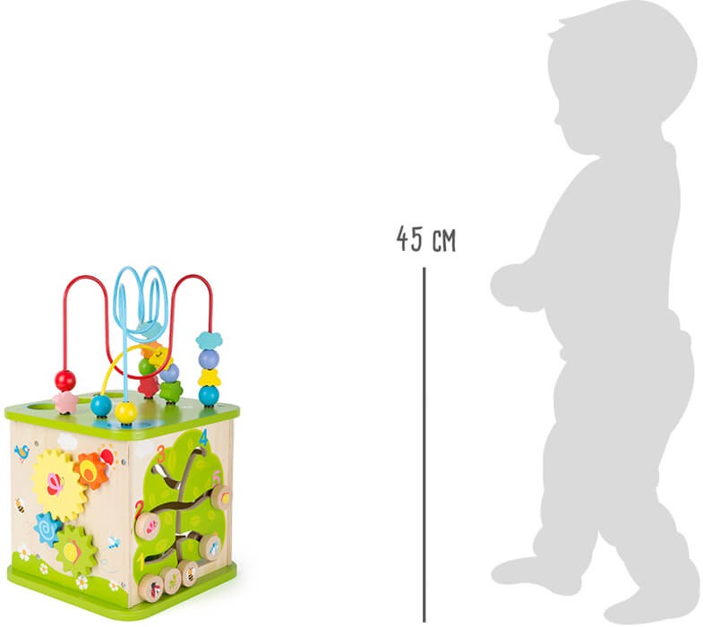 Die Spielwelt der Kleinsten ganz groß! Viele tolle Spielideen sind hier in einem stabilen Holzwürfel zusammengefasst neben Steckformen und Drahtfädelaufsatz sind eine Kugelbahn, ein Koordinationsspiel zum Zahlen lernen und eine Zahnrad-Wand integriert. Das gan...