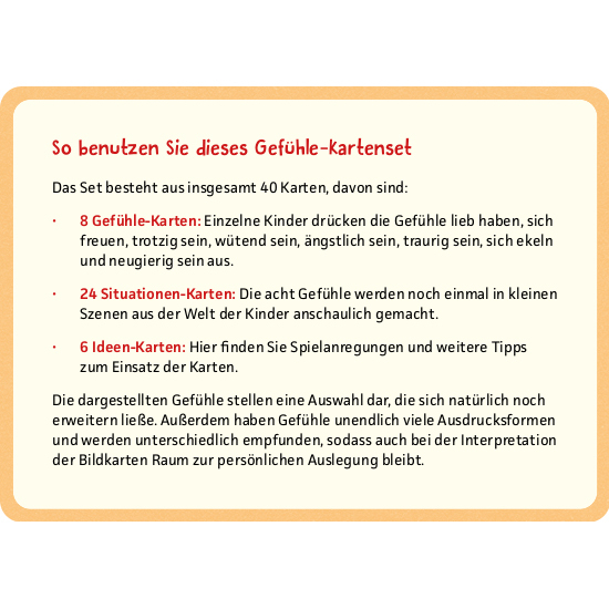 Bildkarten zum Thema Gefühle und Emotionen: Mit diesem Bildkartenset lernen Kinder spielerisch ihre eigene Gefühlswelt kennen. Neben acht Gefühlskarten enthält es 24 illustrierte Szenen aus dem Alltag der Kinder. Acht Textkarten bieten darüber hinaus zahlreich...