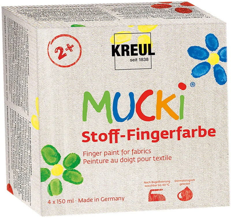 MUCKI Stoff-Fingerfarbe 4er Set 150 ml Fingerfarben-Set für Textilien mit 4 Farbtönen. MUCKI Fingerfarbe in der praktischen 150ml-Kunststoffdose. Die Fingermalfarbe ist leicht verstreichbar, gut deckend, wasserverdünnbar, schnelltrocknend, matt auftrocknend un...