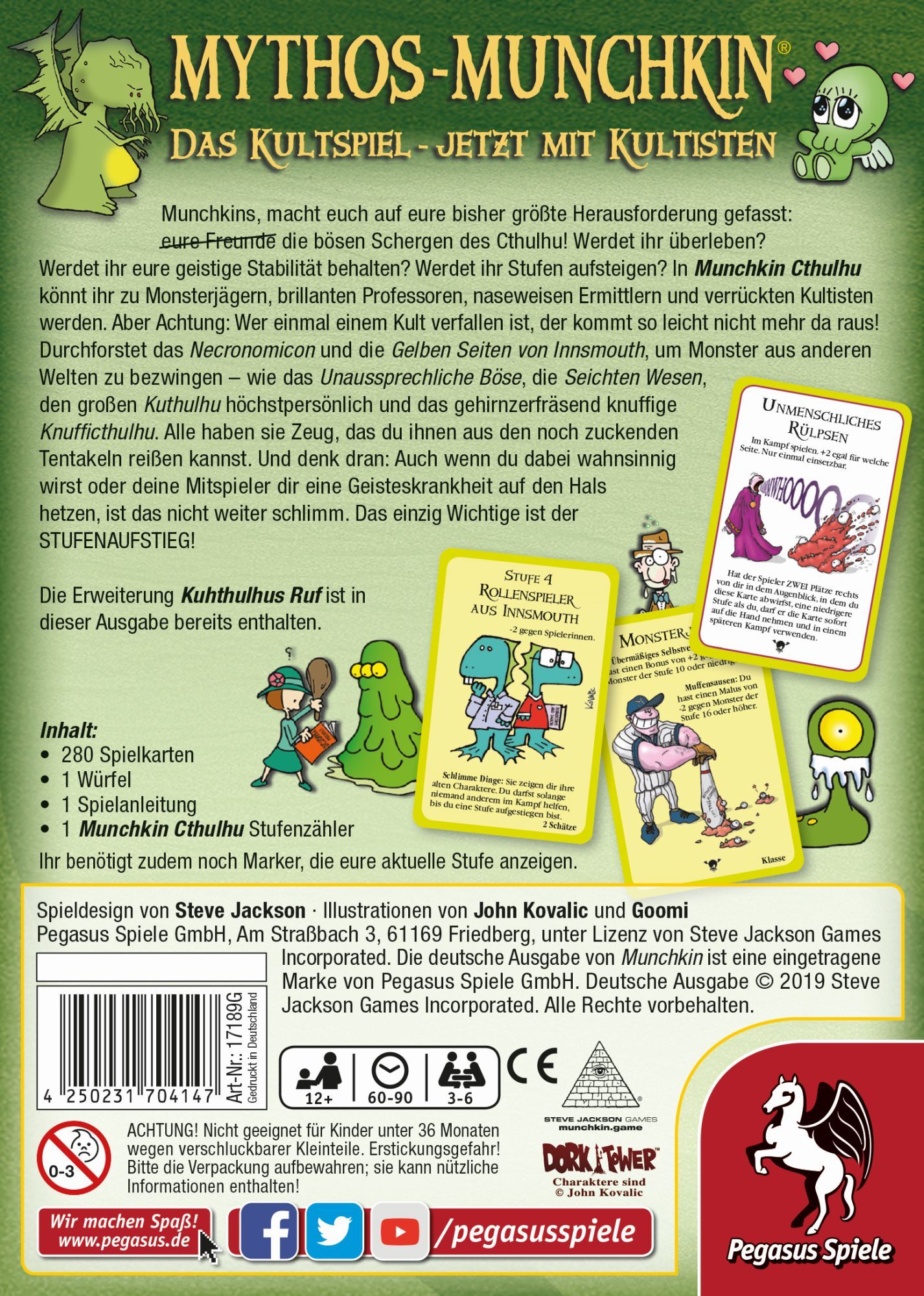 Munchkin Cthulhu bietet vier neue Klassen - inklusive dem Kultisten - und eine Menge klassischer Monster aus Dimensionen außerhalb dieser Realität. Und - klar - sie alle haben Zeug, das du ihren zuckenden Leibern entreißen kannst! Munchkins, macht euch auf eur...