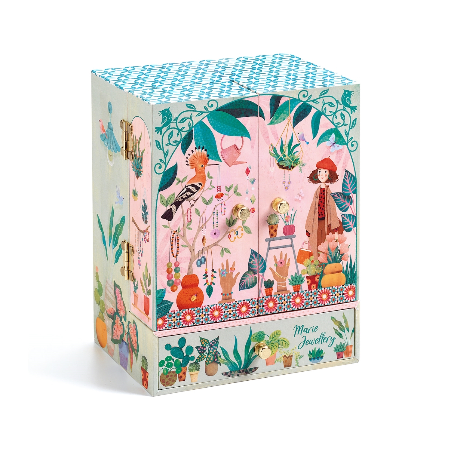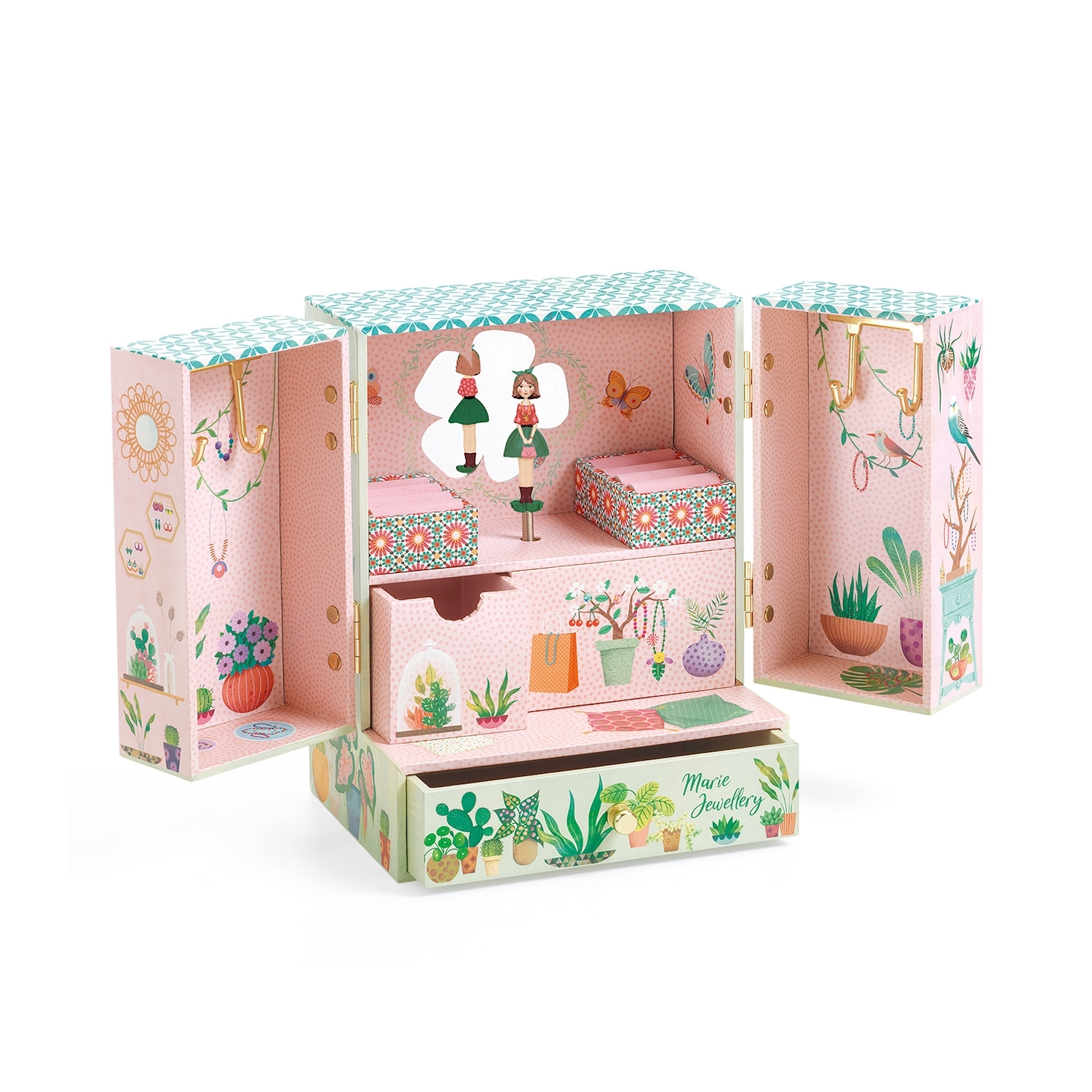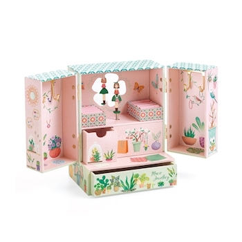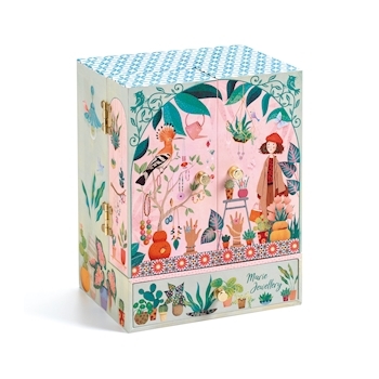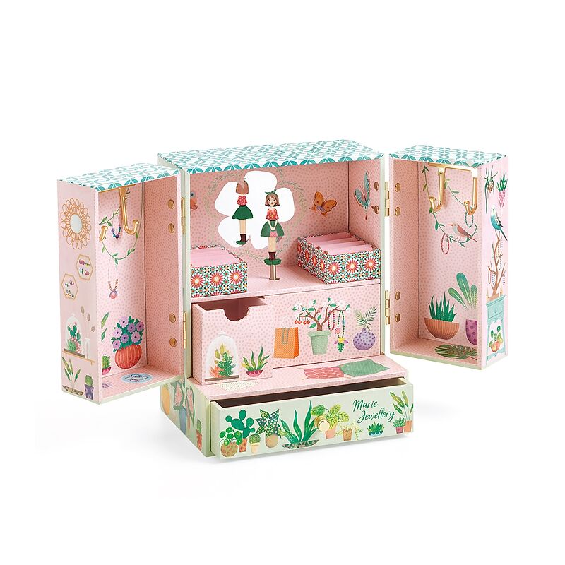 Musik: Einladung zum Walzer von Carl Maria von Weber Geheimer Garten ist eine liebevoll illustrierte Spieluhr mit einer grossen und einer kleinen Schublade für Schmuck und Geheimnisse, zwei Ringhaltern und vier goldenen Haken zum Aufhängen von Halsketten und A...