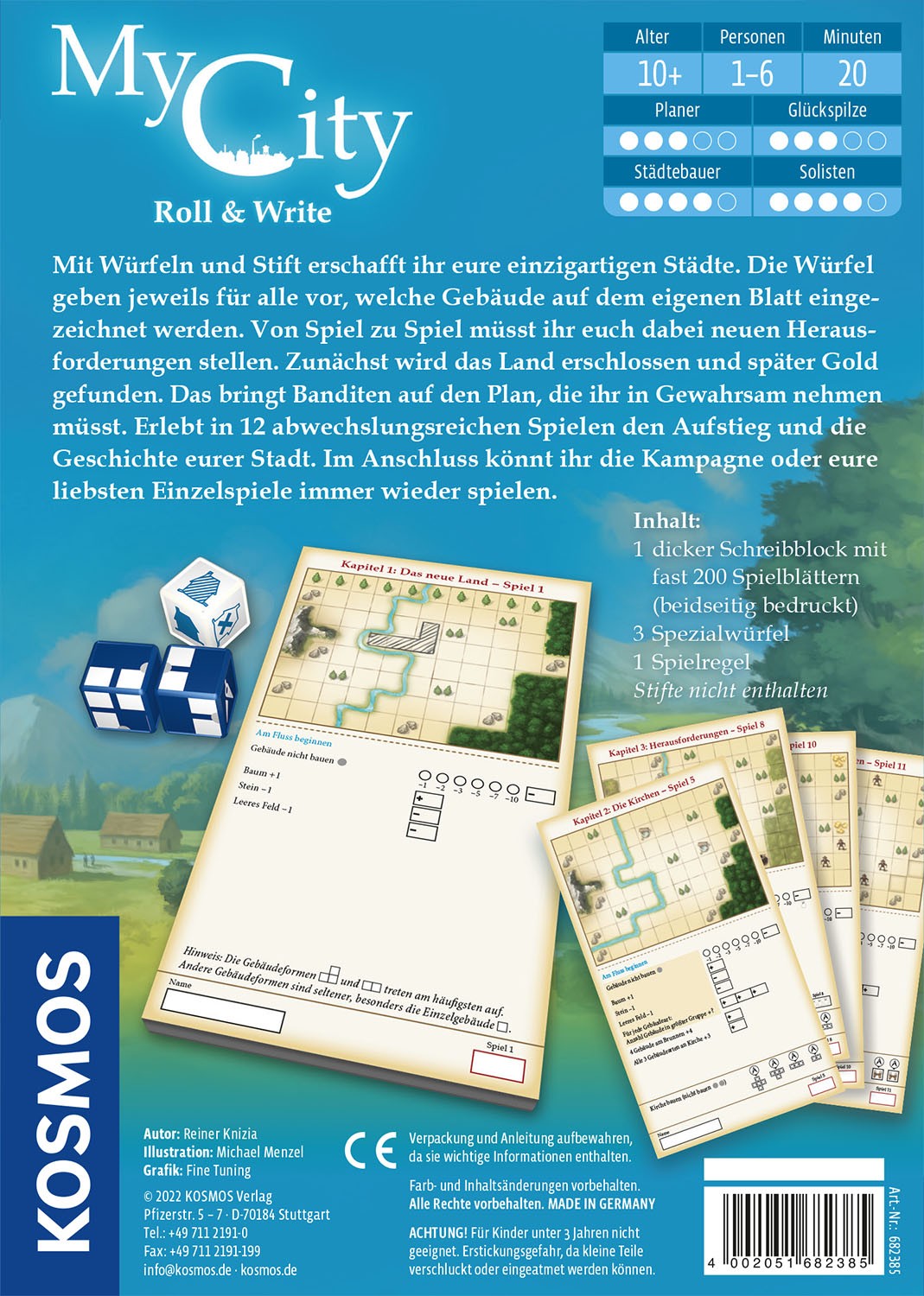 Abwechslungsreiches Spielerlebnis durch 4 spannende Kapitel. In diesem Würfelspiel erschaffen die 16 Spielerinnen und Spieler über 4 Kapitel mit je 3 Spielen ihre einzigartige Stadt. Beim Bauen gilt es, immer neue Herausforderungen zu meistern. Die Würfel gebe...