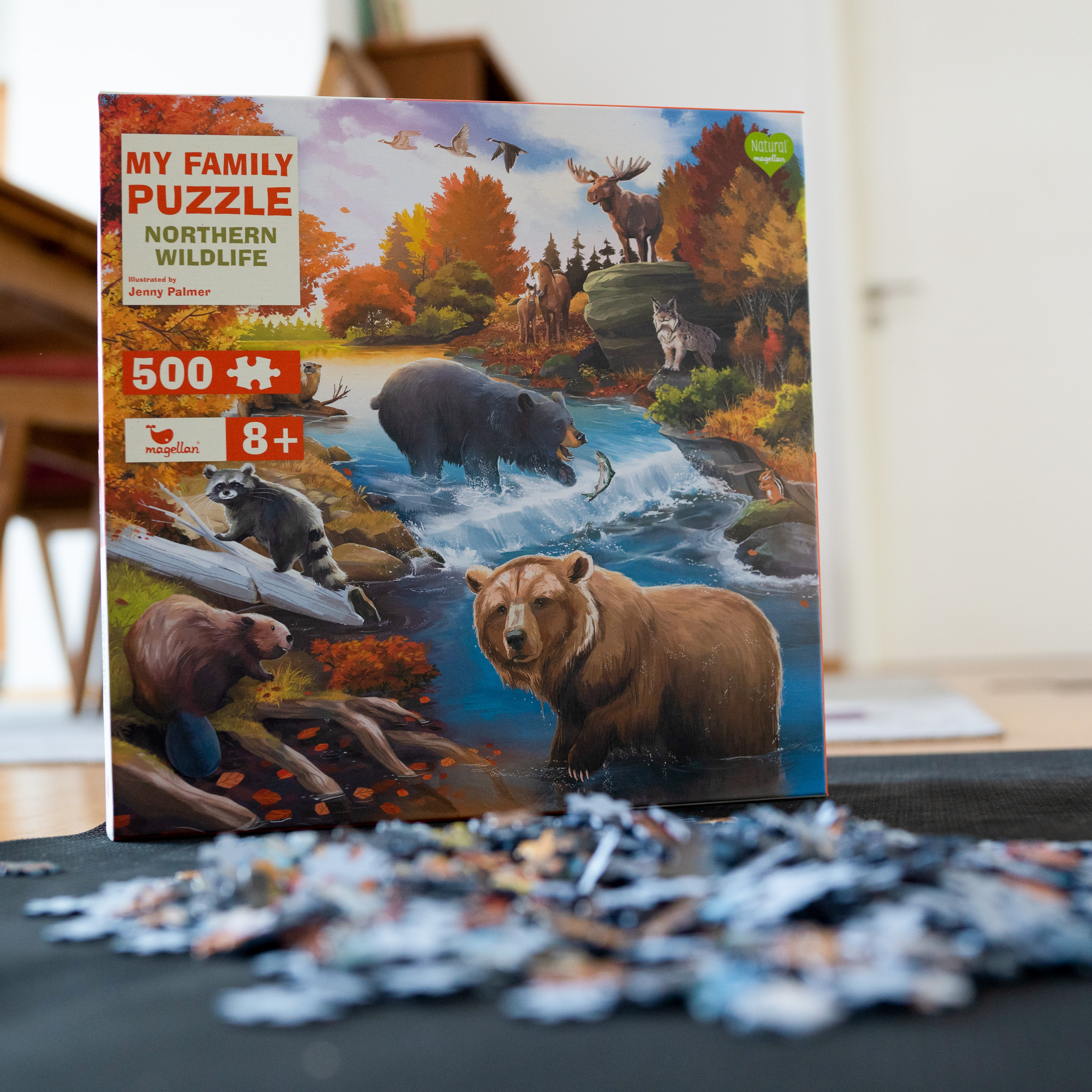 Ein Puzzle mit 500 Teilen für Kinder und Erwachsene. Entdecke die kanadische Flusslandschaft, wo sich zwischen roten Laubwäldern Bären und Wildpferde neben Otter, Waschbär, Luchs oder Streifenhörnchen tummeln. Wenn alle 500 Puzzleteile zusammengefügt werden, ...