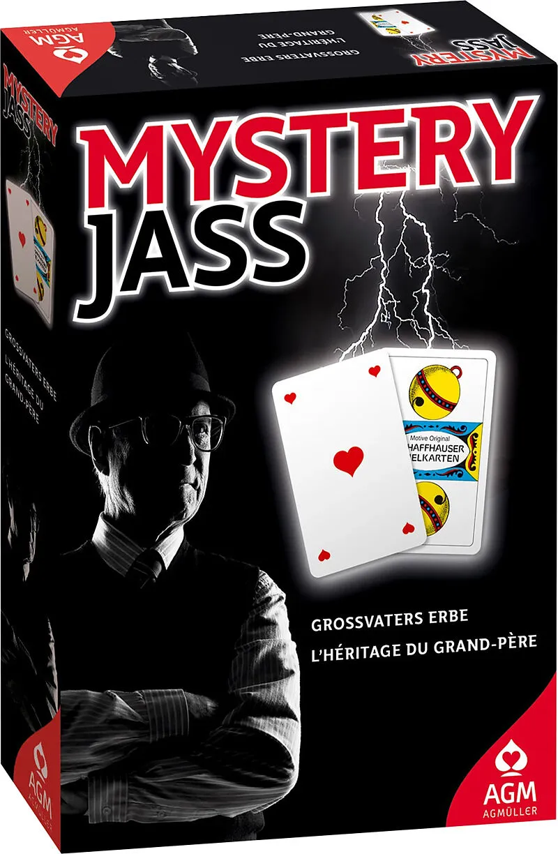 Das Mystery-Jass-Spiel "Grossvaters Erbe" umfasst Opti Jasskarten, Opti Piquet-Karten, 28 Rätselkarten, 28 SOS- und Hinweiskarten und die Spielanleitung.