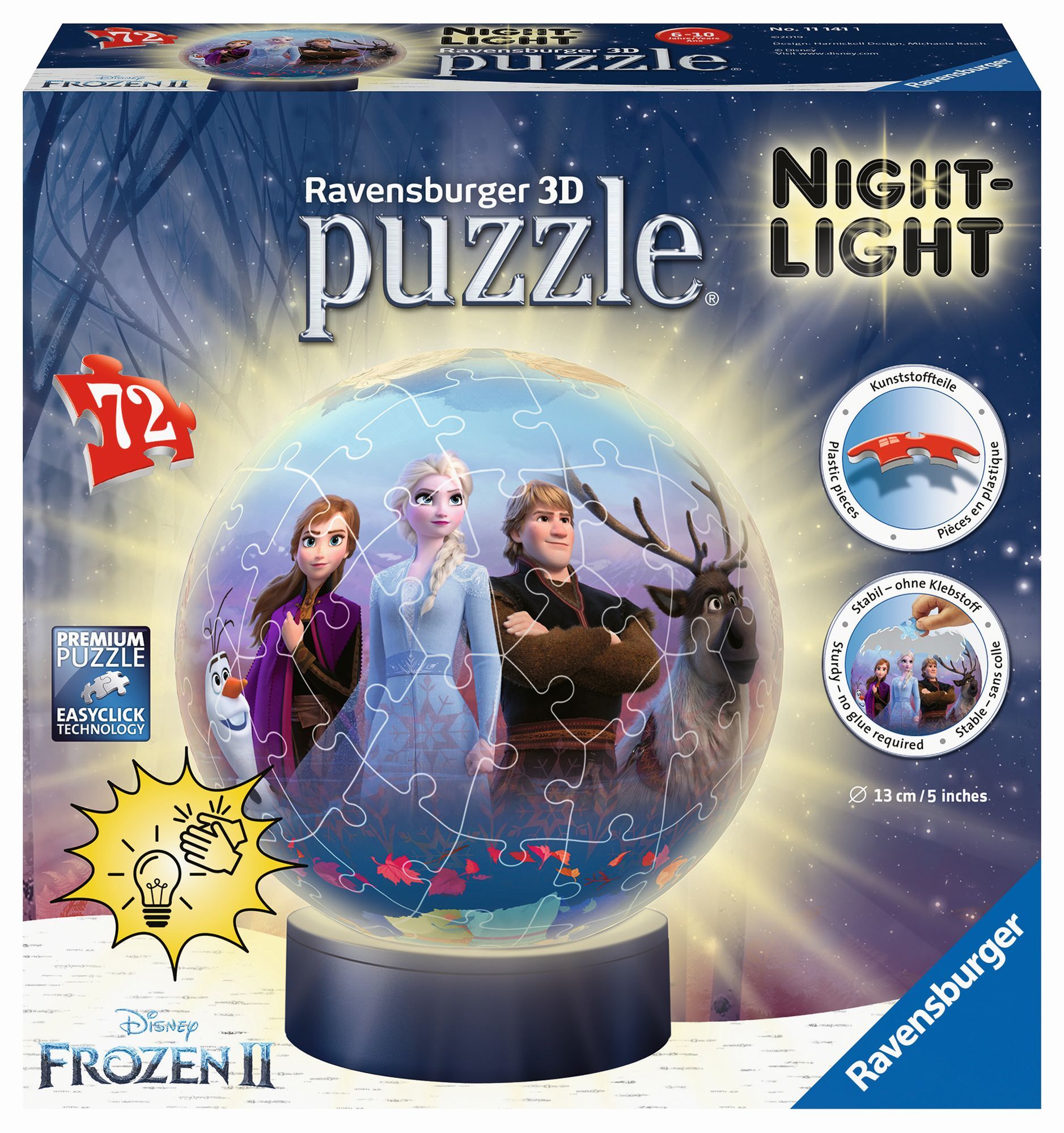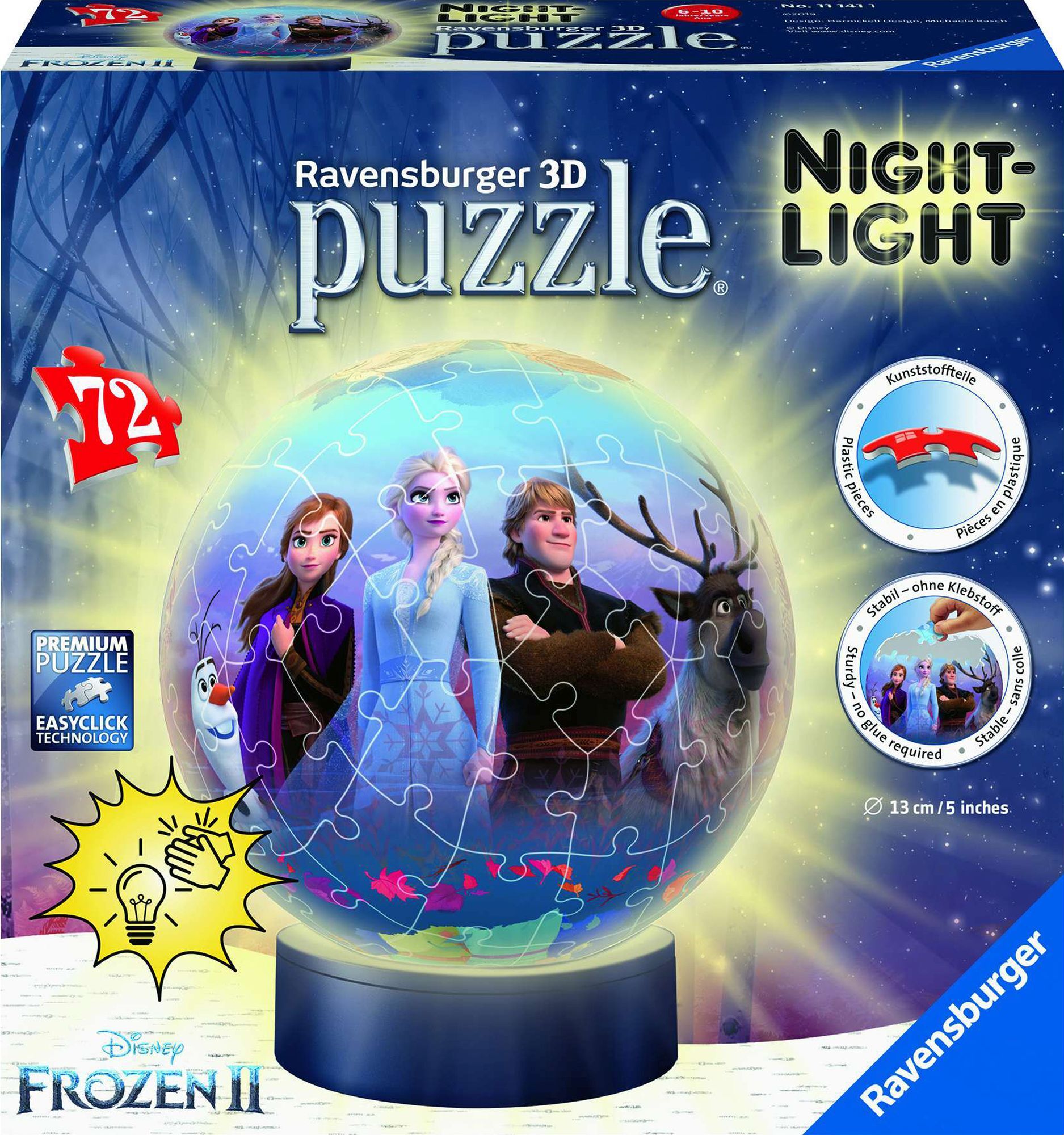 Dieser 3D Puzzle-Ball im coolen Disney Frozen-Design wird mit einem Händeklatschen zum außergewöhnlichen Nachtlicht, wenn der Leuchtsockel den Ball von innen erstrahlen lässt.