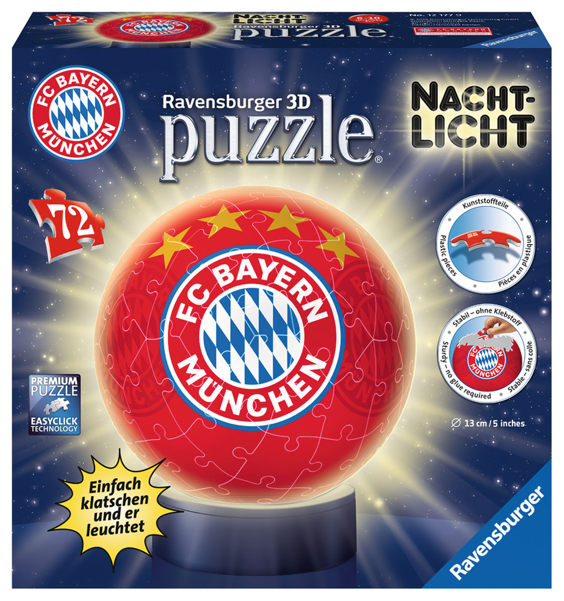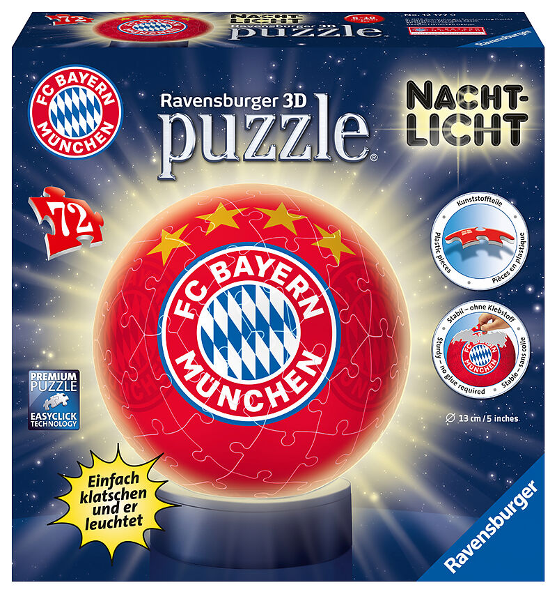 Dieser 3D Puzzle-Ball bringt nicht nur die Augen wahrer FC Bayern Fans zum leuchten: Mit einem Händeklatschen wird er zum faszinierenden Nachtlicht, wenn der Leuchtsockel den Ball von innen erstrahlen lässt. Dank unserer Easyclick Technology passen alle Kunsts...