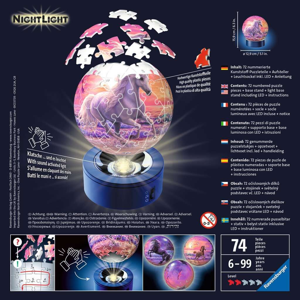 Dieser 3D Puzzle-Ball im coolen Pferde-Design wird mit einem Händeklatschen zum außergewöhnlichen Nachtlicht, wenn der Leuchtsockel den Ball von innen erstrahlen lässt.