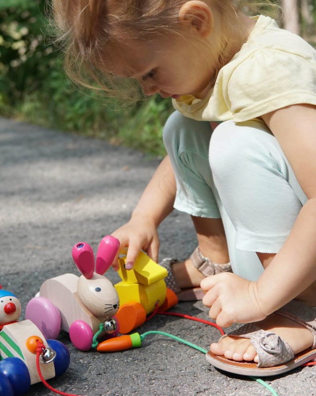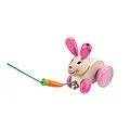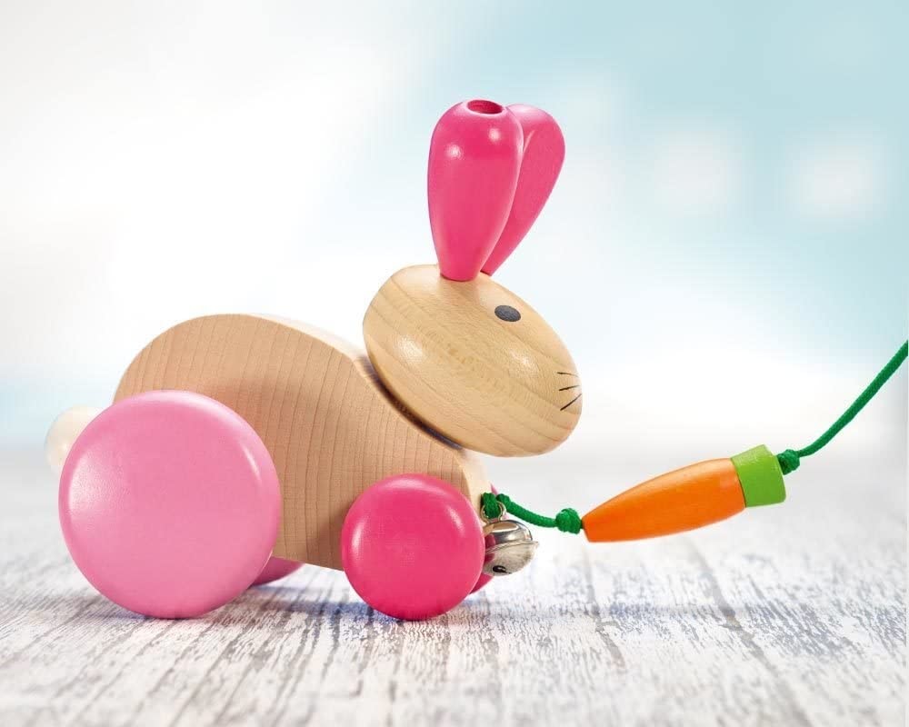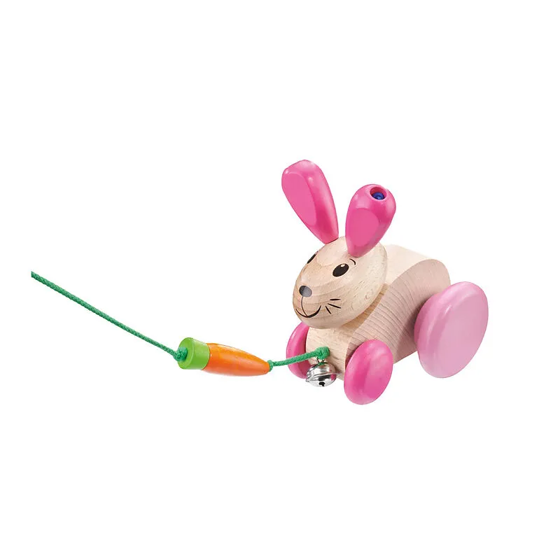 Immer der Rübe und der kleinen Hasenmama nach! Wird Hanna Hoppel gezogen, hoppelt sie der Karotte an der Schnur hinterher und bimmelt mit dem Glöckchen. Nachzieh-Häschen aus Massivholz Immer der Rübe und der kleinen Hasenmama nach! Wird Hanna Hoppel gezogen, h...