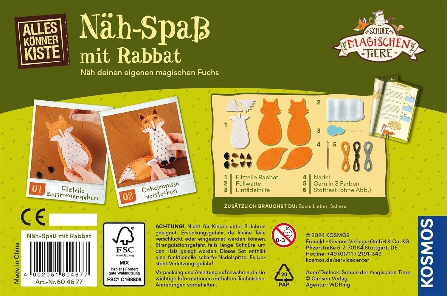 Nähe deinen eigenen magischen Fuchs Niemand kann so gut Geheimnisse hüten wie Rabbat! Mit Nadel und Faden wird der beliebte Fuchs aus der Kinderbuchreihe Die Schule der magischen Tiere zum Leben erweckt. Wie die Filzstoffstücke zusammengenäht und Rabbat mit Wa...