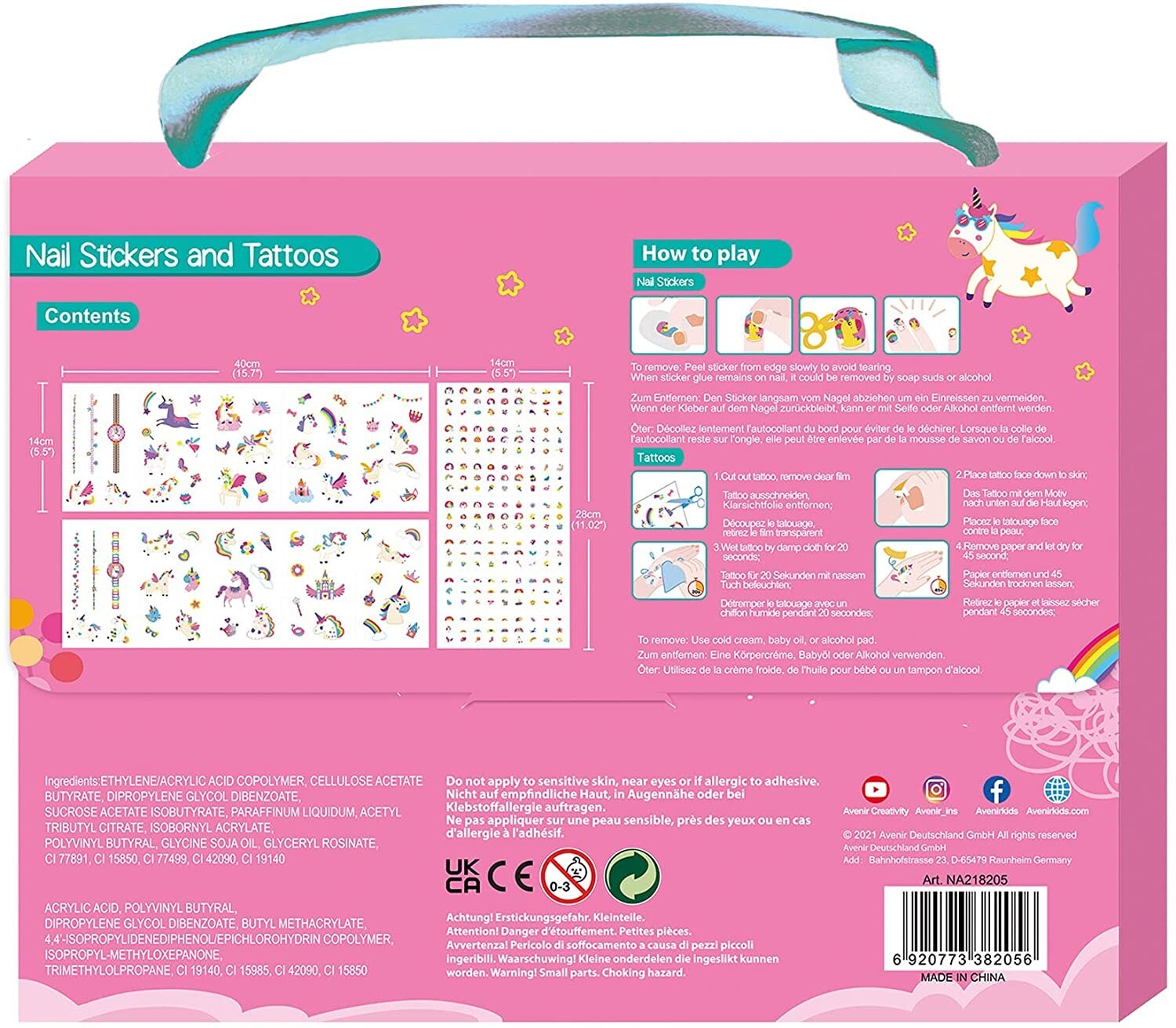 Gestalte deinen eigenen märchenhaften Look zum Thema "Einhorn" - mit witzigen Nagelstickern und temporären Tattoos kannst du deine Kreativität zum Ausdruck bringen! Inhalt: 2 Blätter mit temporären Tattoos und 1 Blatt mit Nagelstickern, praktische Box mit Trag...