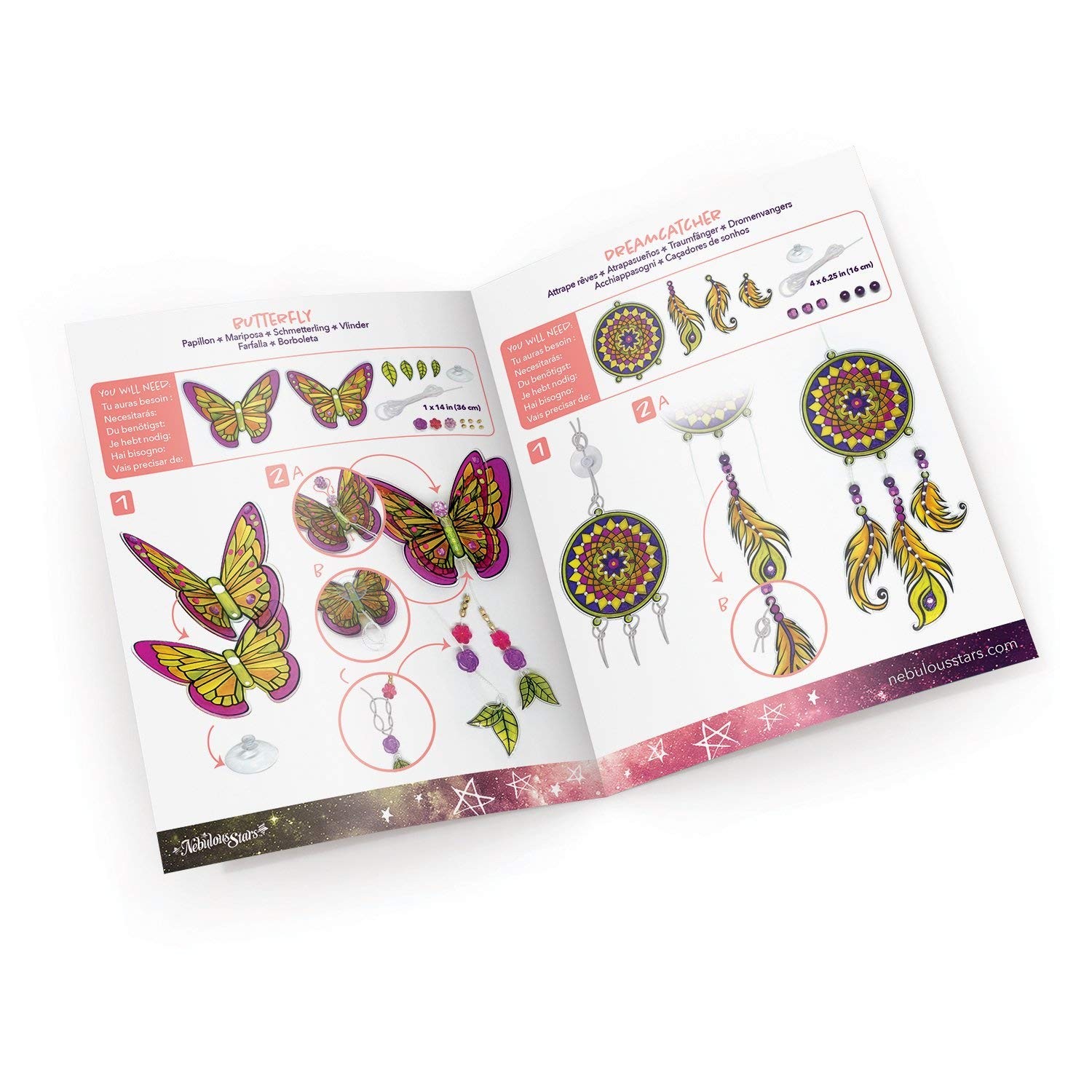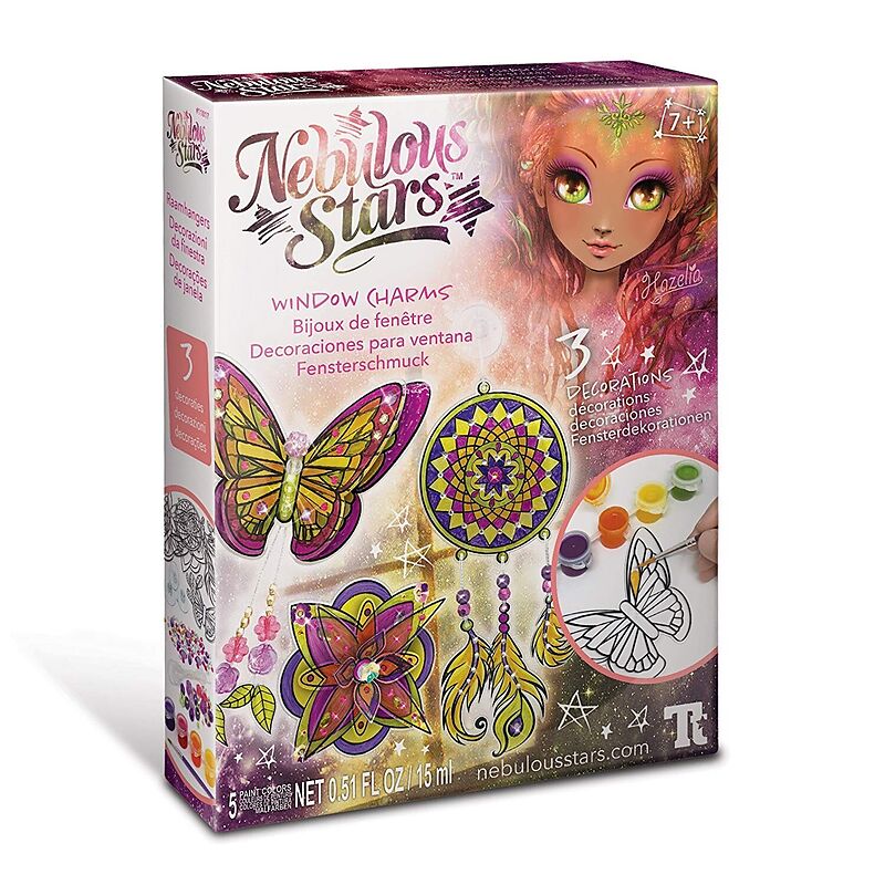 Entwerfe drei magische Anhänger für dein Fenster. Bemale die ausgeschnittenen Schablonen und verziere sie anschließend mit Strasssteinen und Perlen. Füge eine Schnur und einen Saugnapf hinzu, um dein Kunstwerk aufzuhängen.