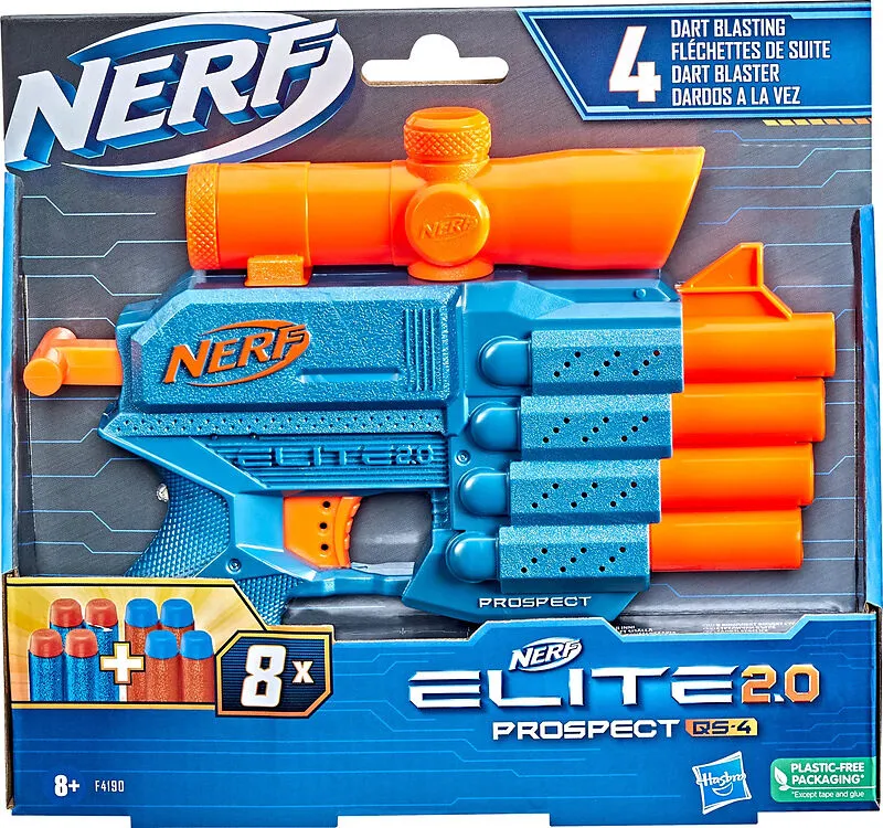 Nerf Elite 2.0 Prospect Qs-4 Der Nerf Elite 2.0 Prospect QS-4 Blaster feuert 4 Darts ab. Er verfügt über 4 Läufe, sodass 4 Darts nacheinander abgefeuert werden können, um die Mitspieler bei Nerf Spielen in den Schatten zu stellen. Dieser Blaster, der schnell u...