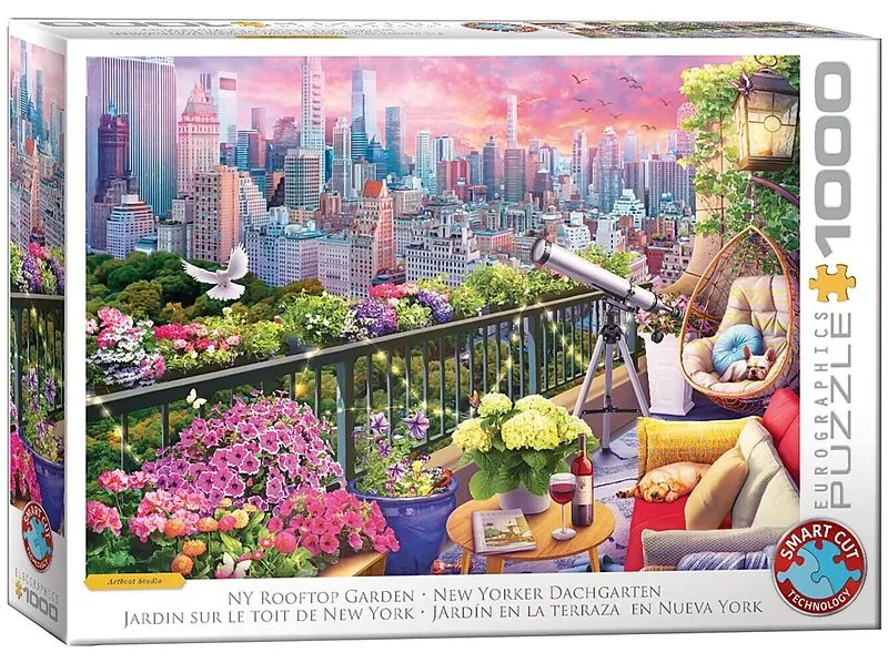 title: New Yorker DachgartenGroßstadtidylle über den Dächern. Ein grüner New-York-Rooftop mit üppigen Blumenkästen, Lichterkette und Teleskop vor der pastellfarbenen Skyline über dem Central Park. Klare MotivbereicheAbendhimmel, Hochhäuser, Baumkronen, Gelände...