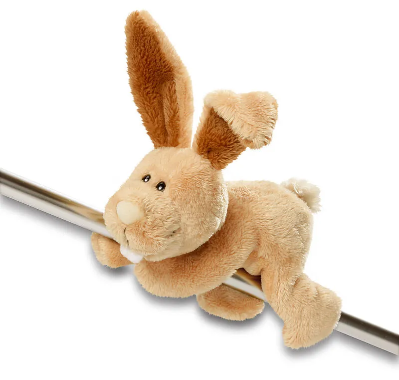 Mit diesem MagNICI, der kleine Magnete in Händen und Füßen hat, findet ein niedliches Plüschhäschen auf allen metallischen Oberflächen Halt.