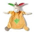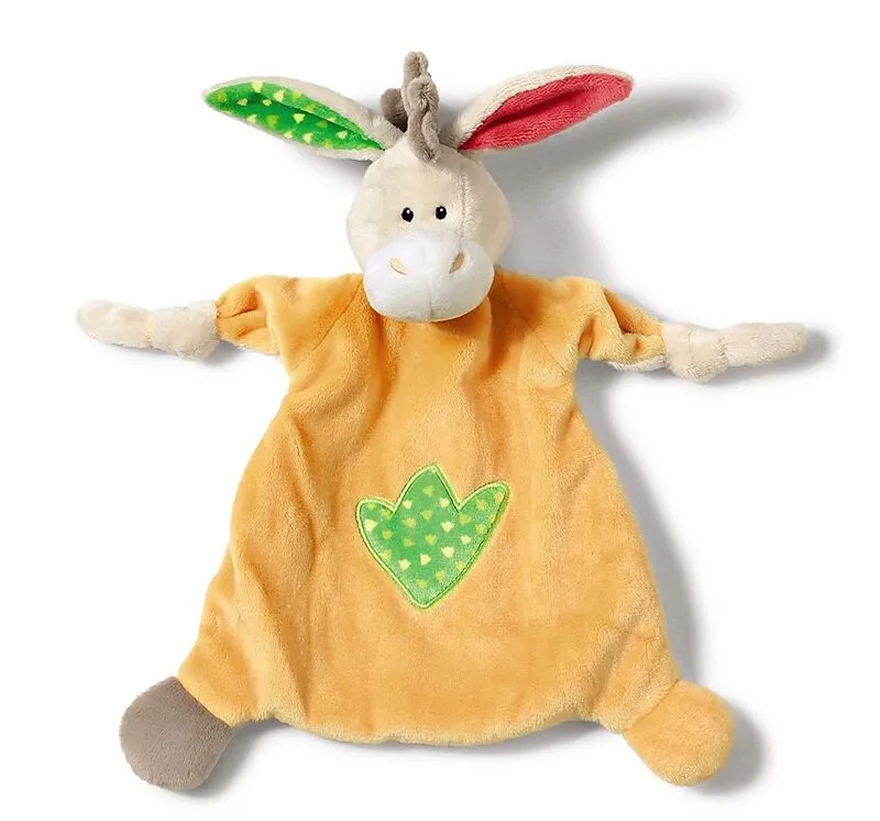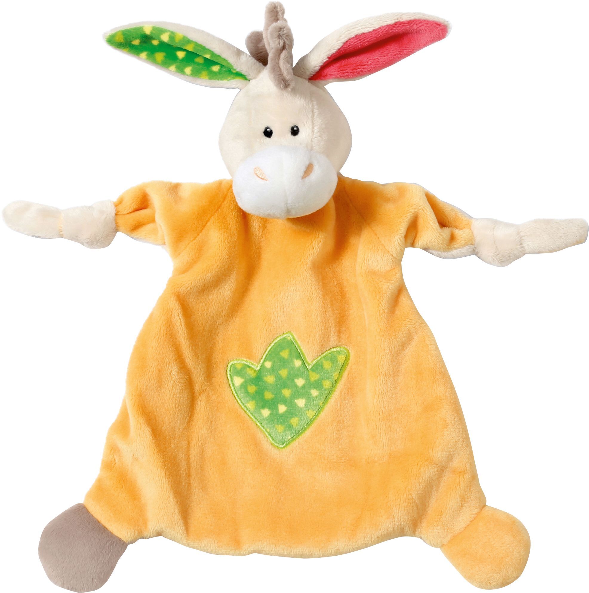 Ein Esel als kuschelweiches Schmusetuch mit orangem Körper, beigem Kopf und Händen sowie einem grauen und einem orangen Fuß. Mit grüner Stickerei auf dem Bauch. Ein Schlappohr ist innen rot, das andere grün gemustert. Dazwischen sitzt sie Eselsmähne in grau. D...