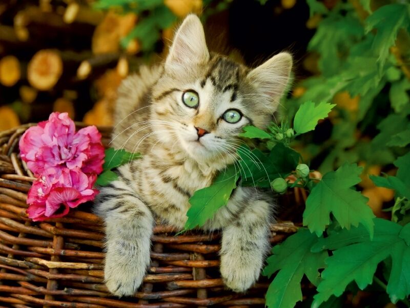 Ein Kätzchen benutzt einen Weidenkorb als Beobachtungs- und Ruheplatz, Katzen lieben geschützte erhöhte Plätze, sie geben ihnen Überblick und Sicherheit. Katzen bereichern einen Garten mit ihrer anmutigen Art.