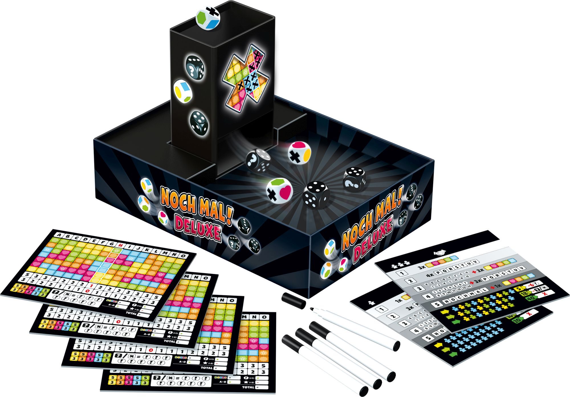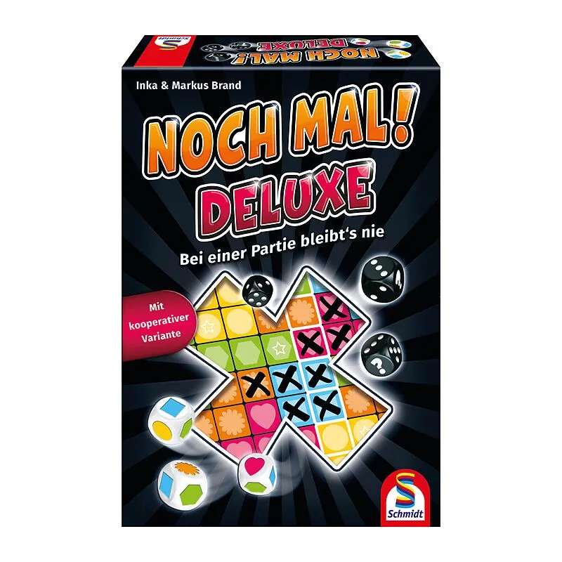Noch mal! DeLuxe Erlebe das erfolgreiche NOCH MAL! jetzt in einer überarbeiteten Deluxe-Ausgabe! Größere, abwischbare Spielbretter, hochwertige Würfel mit Symbolen, durch die die Farben besser zu unterscheiden sind sowie einen Würfelturm, der das Spiel zum Erl...
