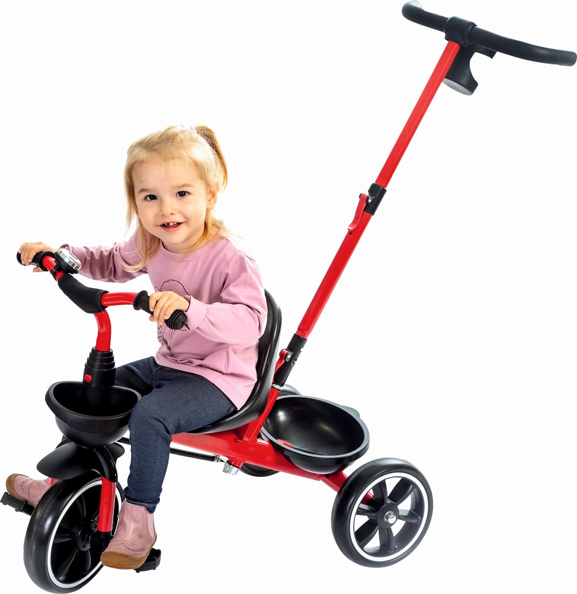 New Sports Dreirad mit Schubstange, mit Freilauf Das New Sports Dreirad mit Klingel und Frontkorb. Die Schubstange ist höhenverstellbar bis ca. 89 cm und 94 cm. Die Räder sind aus EVA Schaum. Das Vorderrad hat 10 Zoll und die Hinterräder haben 8 Zoll. Die Grif...