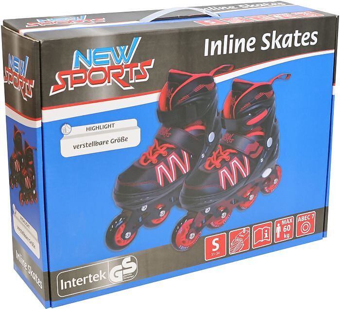 New Sports Inliner schwarz/rot ABEC 7, Größe 31-34 New Sports Inliner schwarz/rot, PU-Rollen, ABEC 7 Carbon Kugellager. Verstellbare Größe von 31 bis 34. Schaft mit einem Schnallen-Verschluss. Schnürung und Klettbandfixierung. 1 Bremse. Maximale Belastbarkeit ...