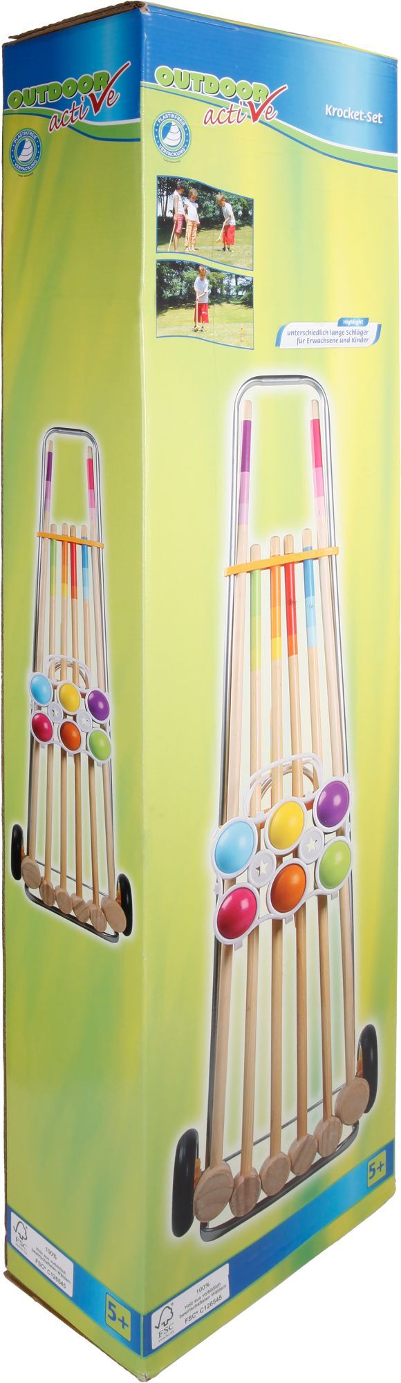 Outdoor active Krocketwagen für 6 Spieler, Länge 92 cm Outdoor active Krocketwagen für 6 Spieler. Länge ca. 92 cm. Dieses Krocketspiel ist ausgestattet mit 6 verschiedenen farbigen Krocketschlägern, 6 Kugeln, Toren und einem stabilen Wagen. Länge des Schlägers...