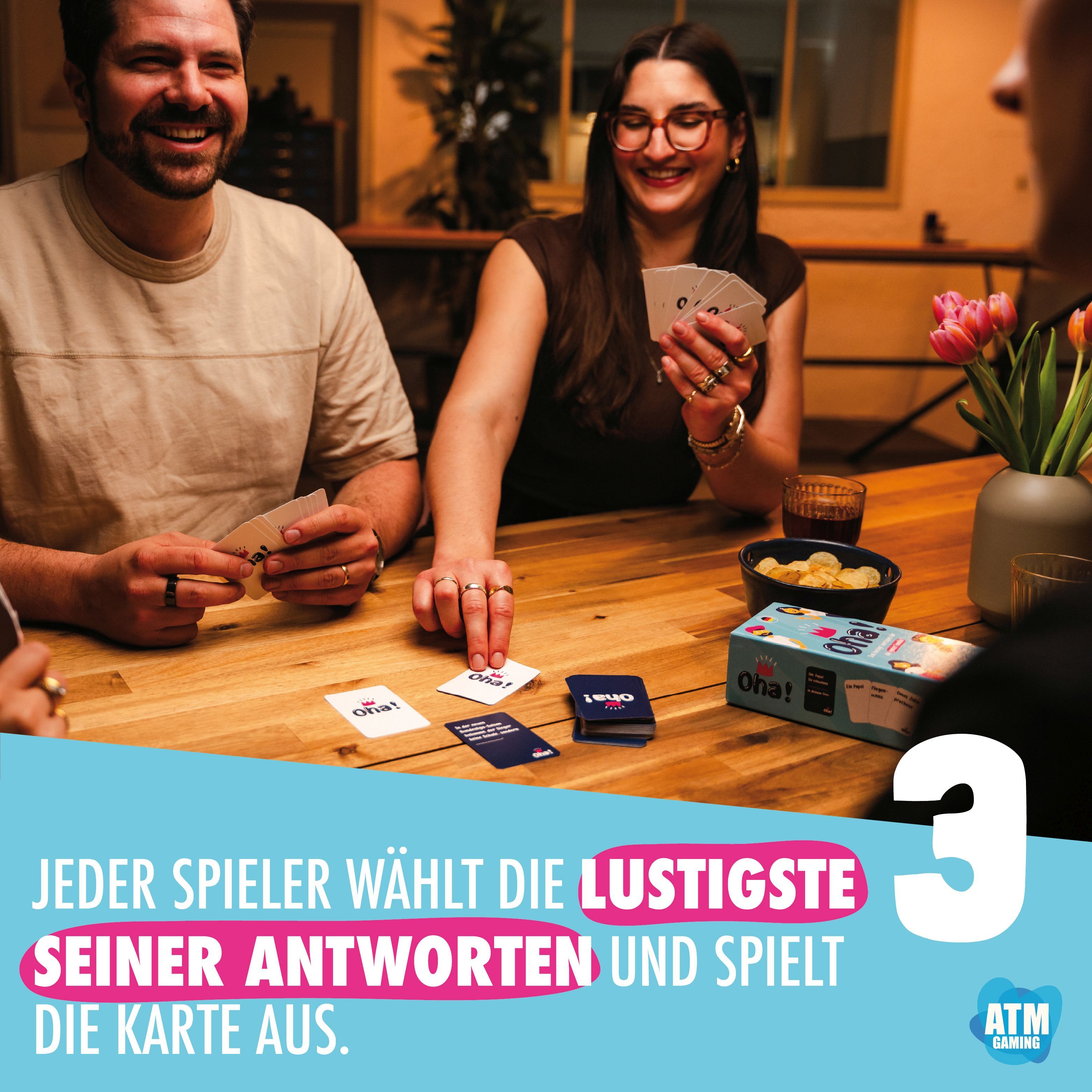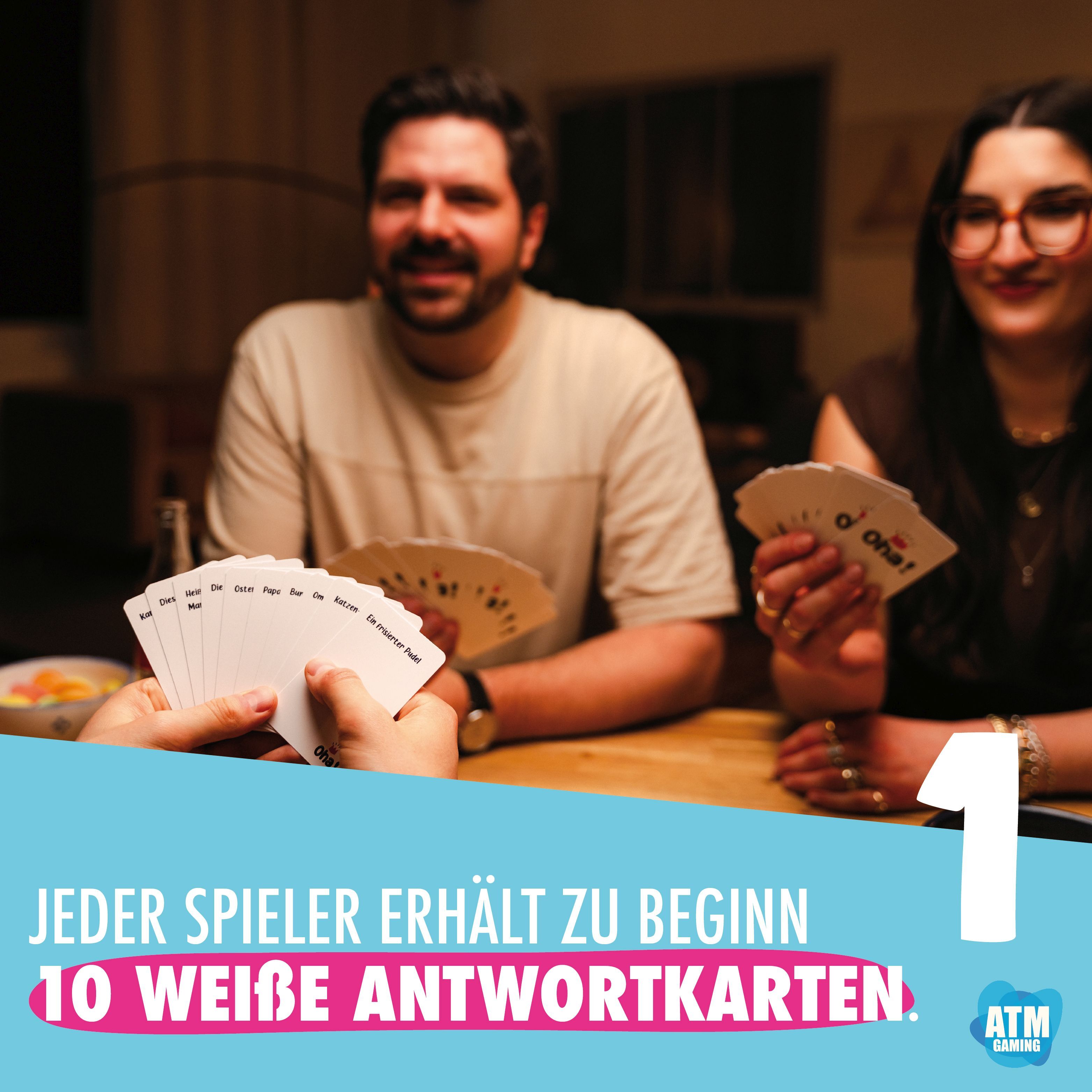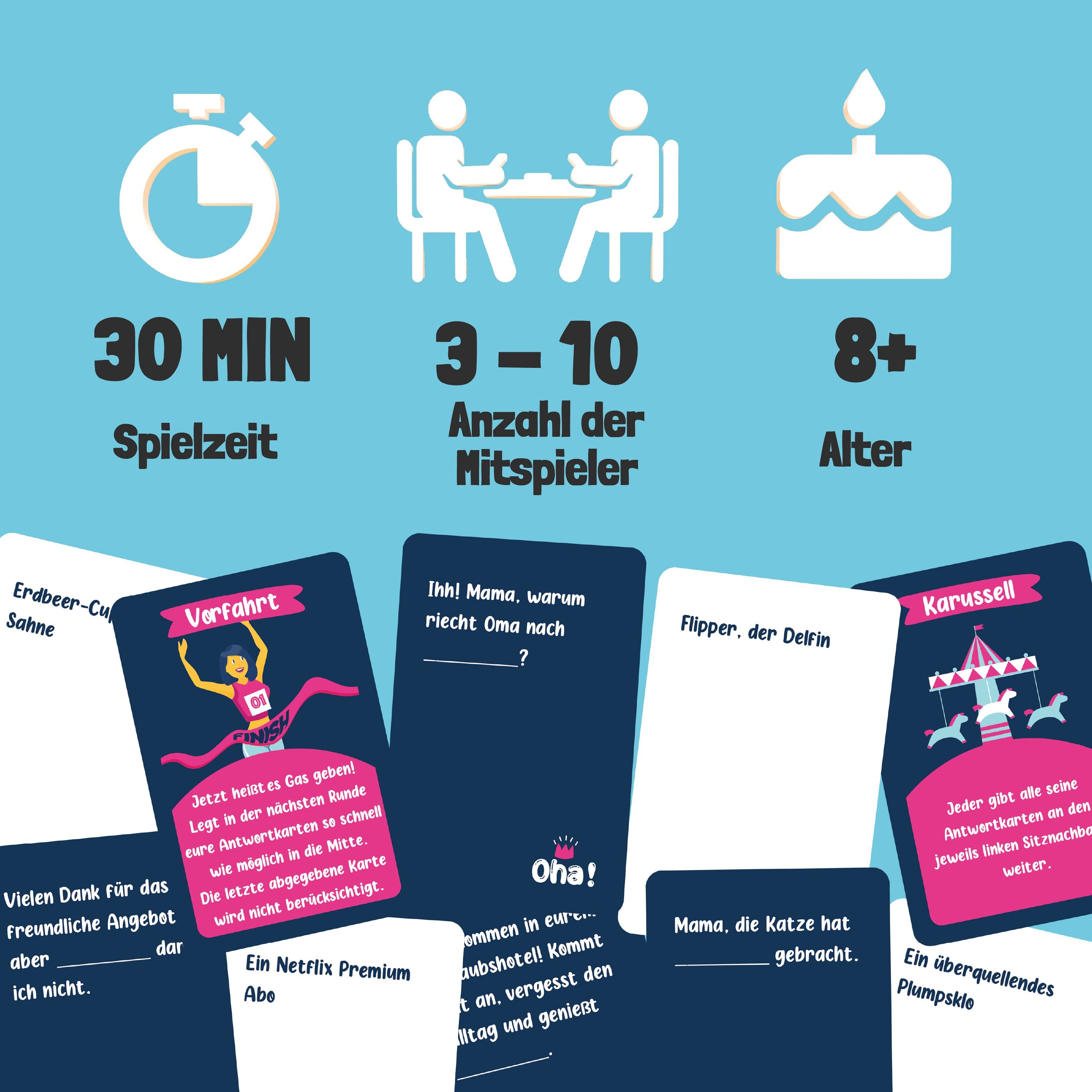 Wählt die richtigen Worte und erzeugt die witzigsten Kombinationen! Lese den Satz auf Deiner Karte laut vor. Alle anderen Spieler wählen nun eine möglichst witzige Antwortkarte aus ihrer Hand aus. Du entscheidest, welche Kombination gewinnt.