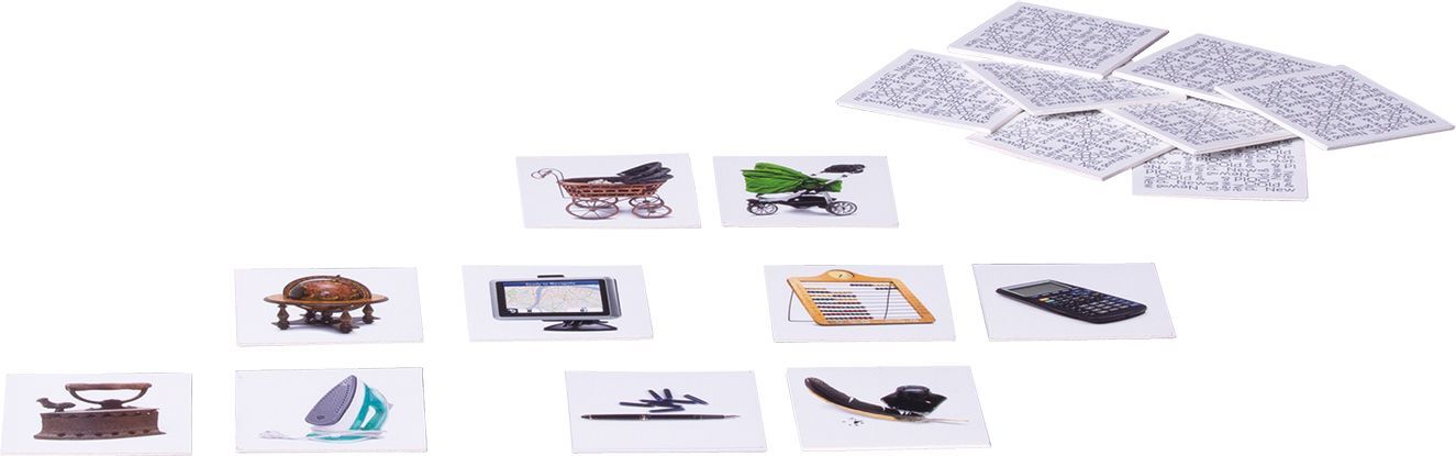 Dieses Memospiel entführt in längst vergangene Zeiten und zeigt durch den direkten Vergleich, wie sich Erfindungen von alltäglichen Gegenständen im Laufe der Jahrzente weiterentwickelt haben.