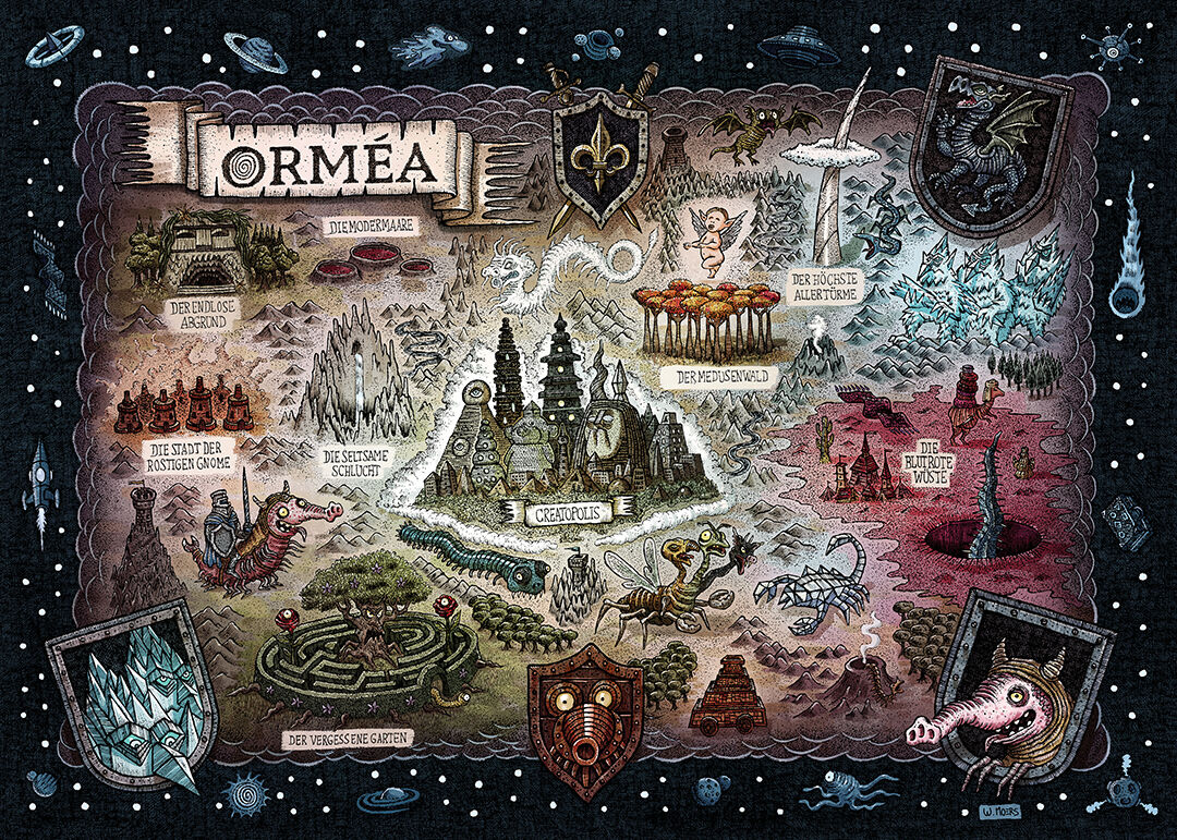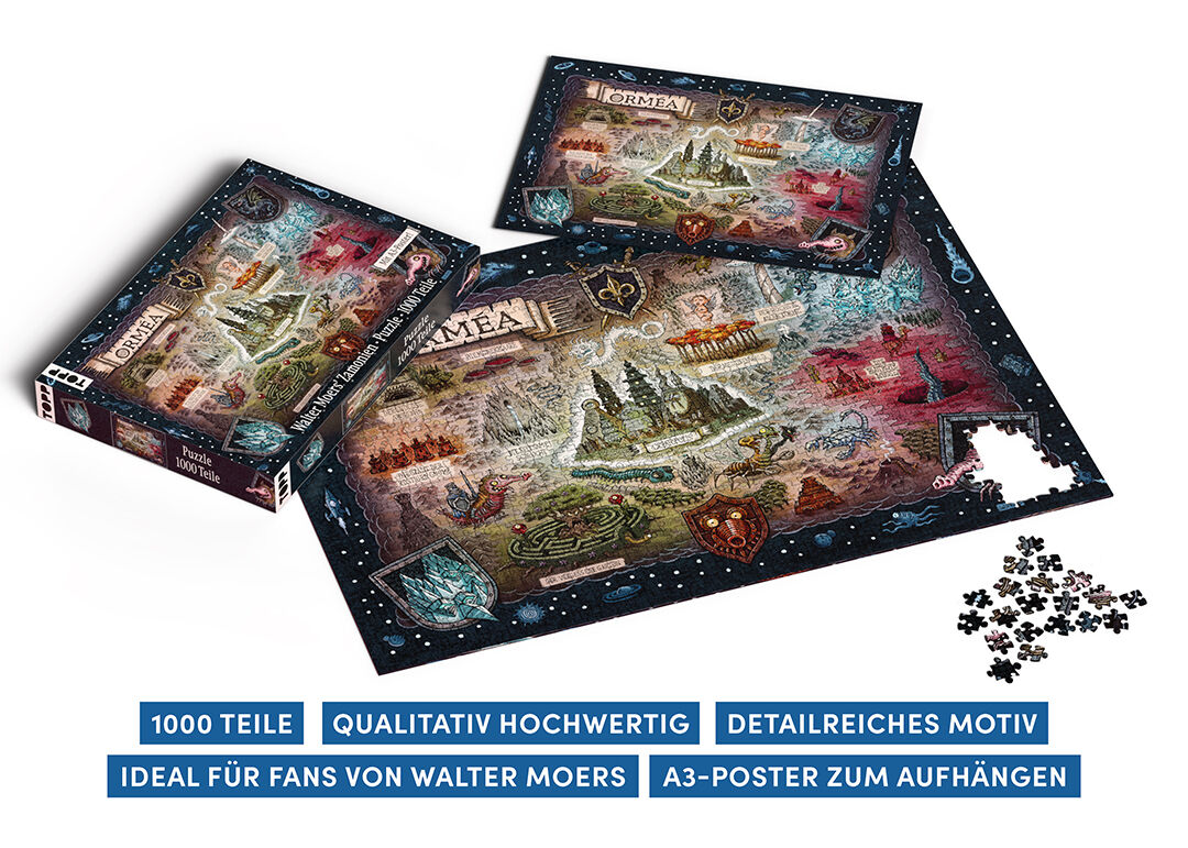 Die Welt von Orméa in 1000 Teilen - das exklusive Walter-Moers-Puzzle! Puzzle die originale Landkarte aus Walter Moers' aktuellem Roman QWERT, mit vielen ikonischen Figuren und Orten aus dem fantastischen Moers-Universum. Vom Medusenwald über die Stadt d...