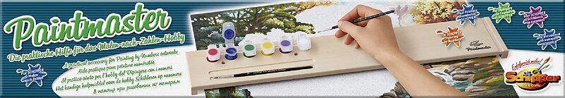 Der Paintmaster Der Paintmaster aus Lindenholz ist eine praktische Hilfe für das Malen-nach-Zahlen-Hobby. Die verschiebbare Holzleiste 540 x 90 x 18 mm kann in jeder Richtung über der Malvorlage platziert werden. Die Farbtöpfchen stehen sicher und griffbereit ...
