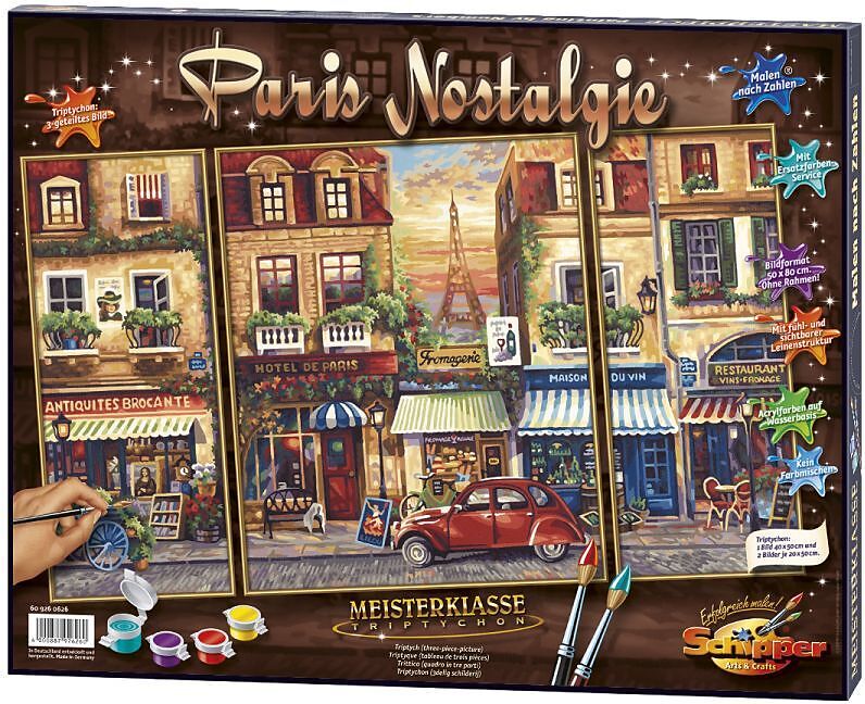 Nicht geeignet für Kinder unter 3 Jahren. Es besteht Erstickungsgefahr wegen verschluckbarer Kleinteile. MNZ-Paris Nostalgie (Triptychon) von Schipper (Noris) - Meisterklasse Triptychon;Malen nach Zahlen, Maltafel 50 x 80 cm mit Leinenstruktur. Malfertig vorge...