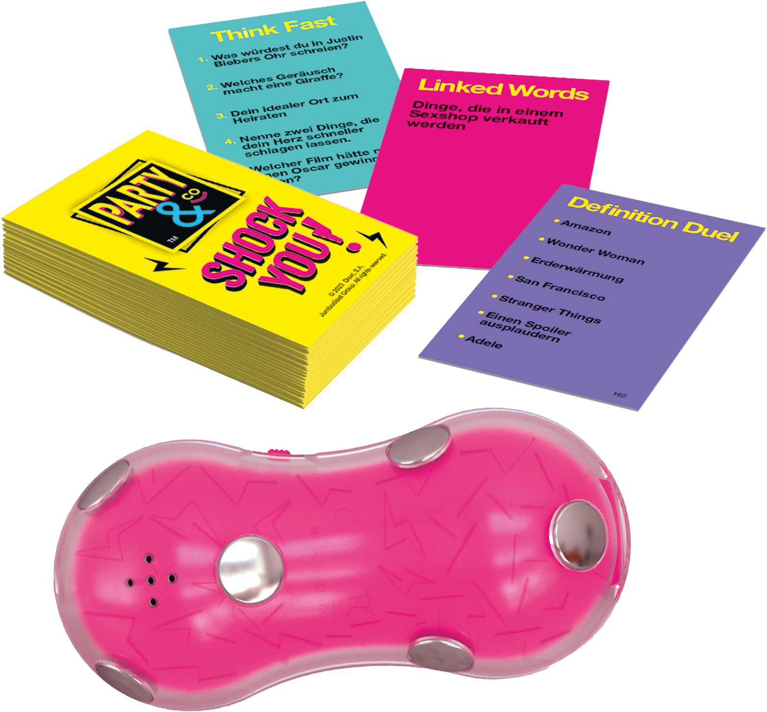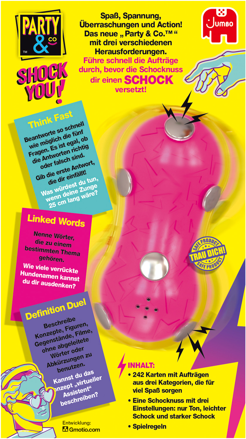 Das neue Party & Co. hat drei verschiedene Arten von Aufgaben. Ist die Zeit vorbei, löst die Schocknuss einen Impuls aus. Die Schocknuss hat drei Einstellungsmöglichkeiten: kein Impuls, wenig Impuls und durchschnittlicher Impuls.