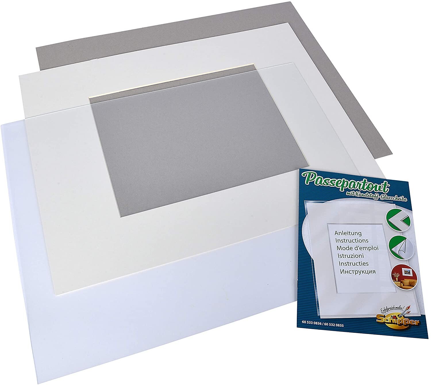 Vollständiges Set - Der Lieferumfang beinhaltet das Passepartout im Format 24 x 30 cm, eine Kunststoff-Glasscheibe mit Schutzfolie sowie eine Rückwandpappe im Format 40 x 50cm und eine ausführliche Anleitung. - Kunstwerk Für die optimale Rahmung mit Schrägschn...