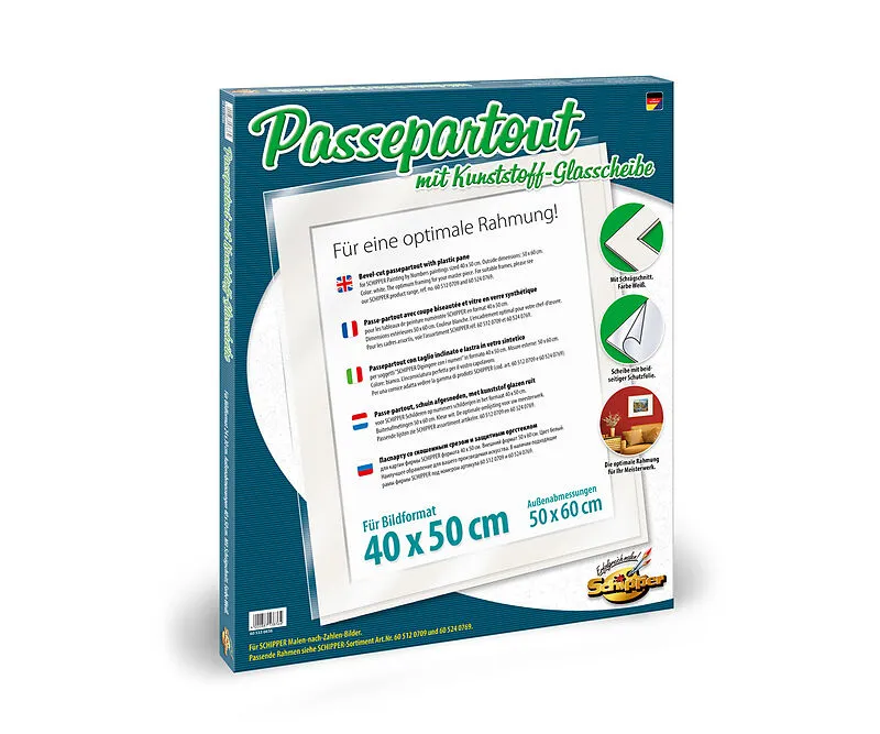 Vollständiges Set - Der Lieferumfang beinhaltet das Passepartout im Format 40 x 50 cm, eine Kunststoff-Glasscheibe mit Schutzfolie sowie eine Rückwandpappe im Format 50 x 60cm und eine ausführliche Anleitung. - Kunstwerk Für die optimale Rahmung mit Schrägschn...