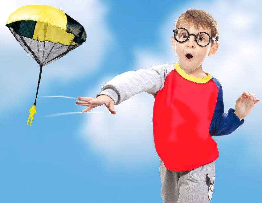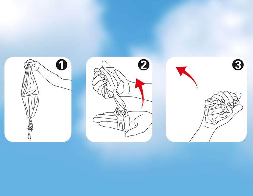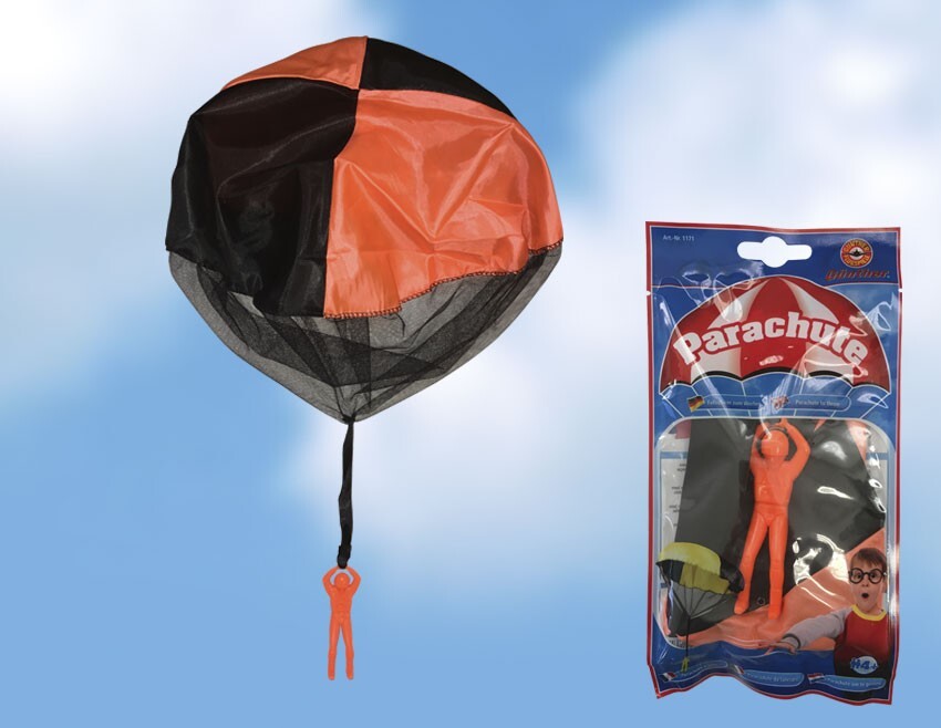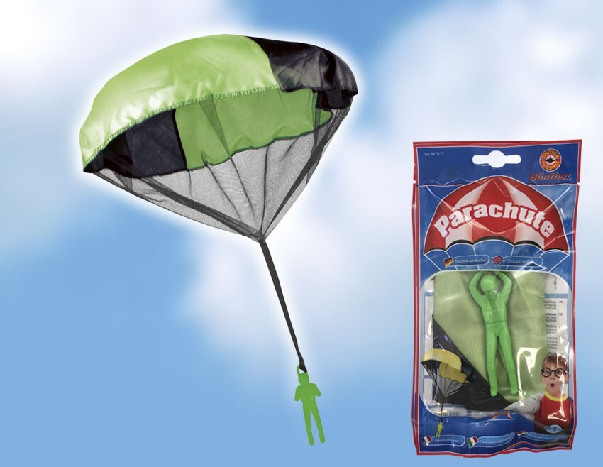 Fallschirm zum Werfen. Den Fallschirm einfach zusammenfalten und nach oben oder vorne werfen. Der Fallschirm öffnet sich und der Fallschirmspringer gleitet zu Boden. Ideal für Kinder ab 4 Jahren. Durchmesser 46 cm. Der Artikel ist farblich sortiert - eine Ausw...