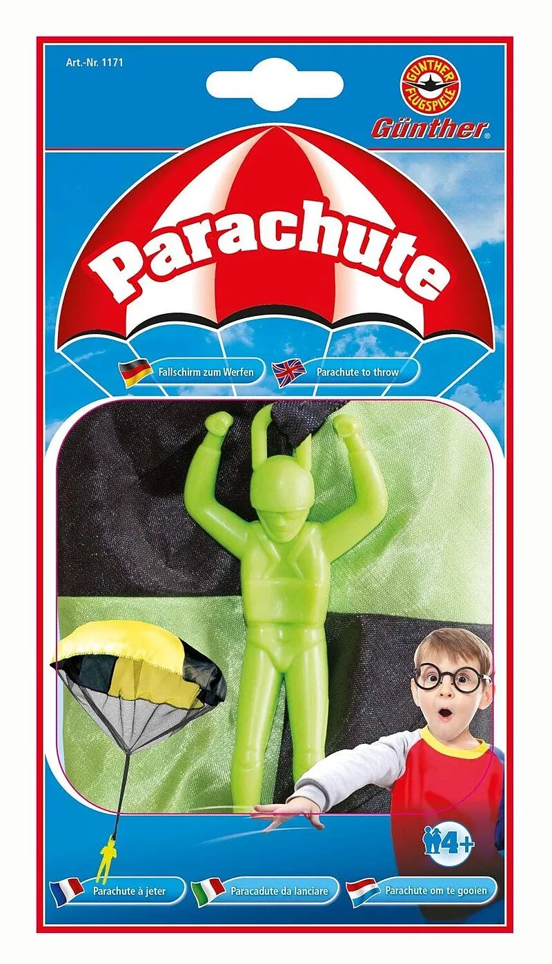 Fallschirm zum Werfen. Den Fallschirm einfach zusammenfalten und nach oben oder vorne werfen. Der Fallschirm öffnet sich und der Fallschirmspringer gleitet zu Boden. Ideal für Kinder ab 4 Jahren. Durchmesser 46 cm. Der Artikel ist farblich sortiert - eine Ausw...