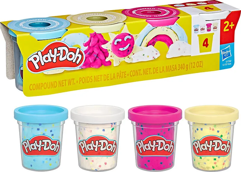 PD 4Er-Pack Konfettiknete Mit dem Play-Doh 4er-Pack Konfettiknete erhalten die fantasievollen Kreationen der Kinder einen festlichen Look. Jede 85g-Dose enthält klassische Play-Doh Spielknete mit eingemischten Papierschnipseln. Dies ist ein großartiges Geschen...