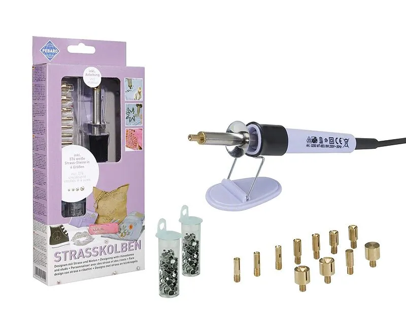Starter-Set mit 576 Strass-Steinen zum sofortigen loslegen INHALT: Strasskolben, Auflageböckchen, 1 Rad mit insgesamt 576 Strass-Steinen kristall in 4 Größen (Art. 0259-71), 4 Picker P2-P5 (Art. 0259-1) für beiliegende Strass-Steine, 6 Picker (z. B. für Swarov...